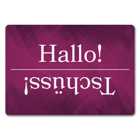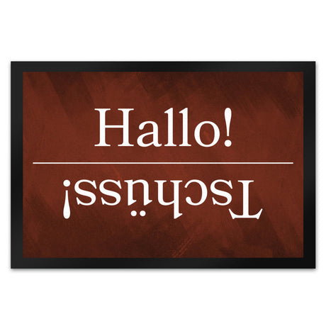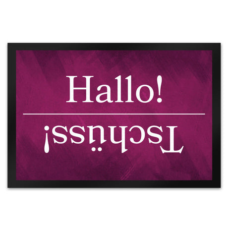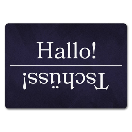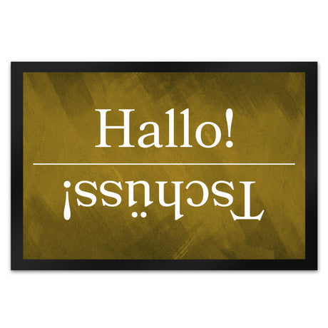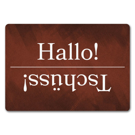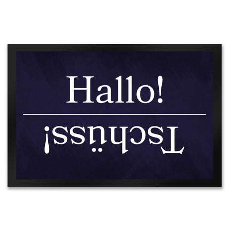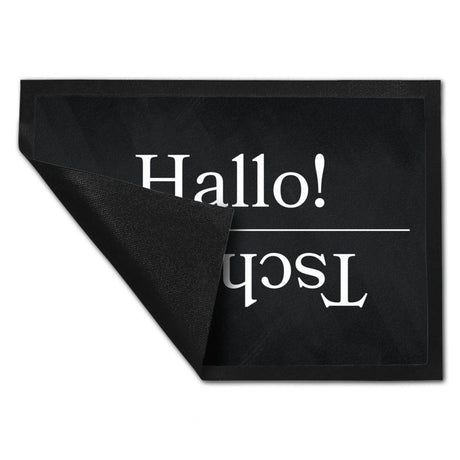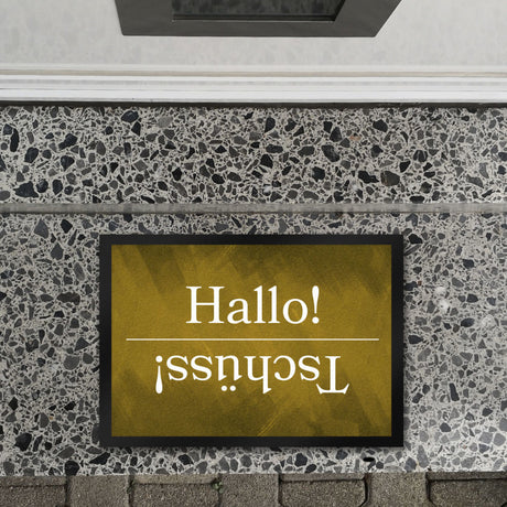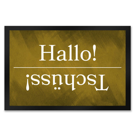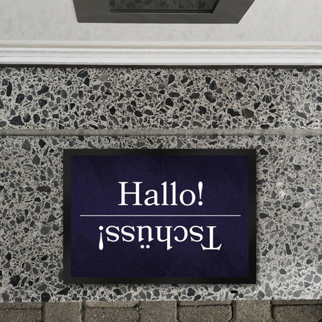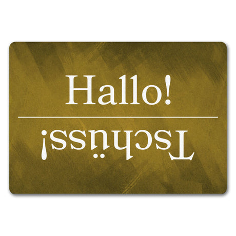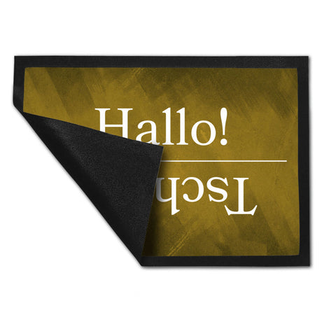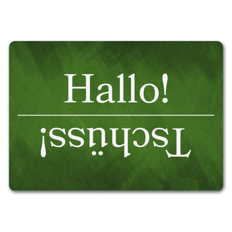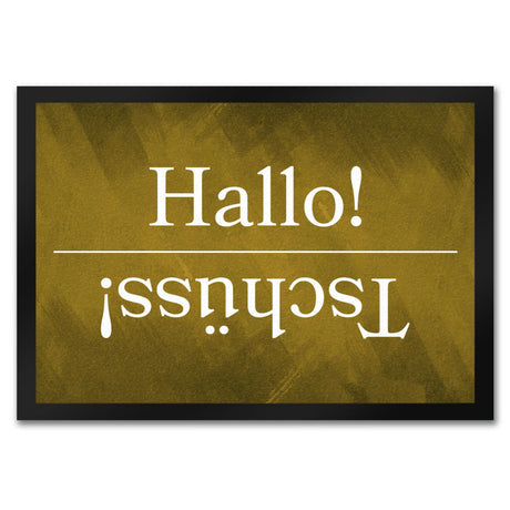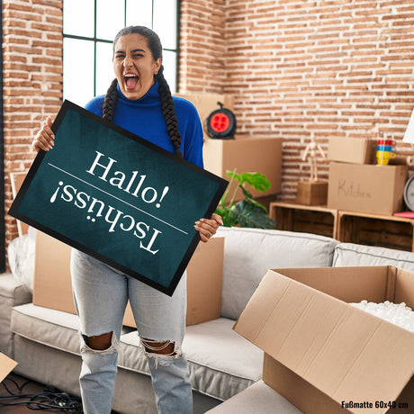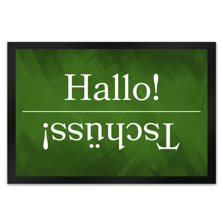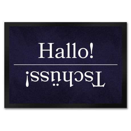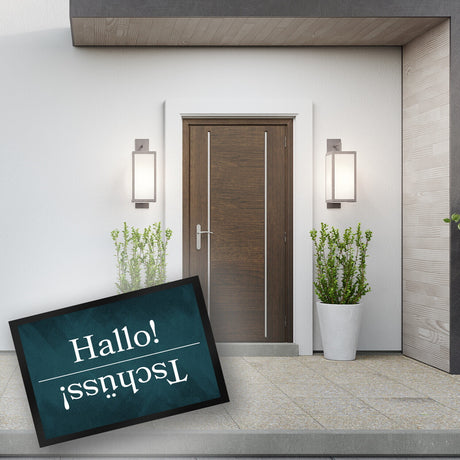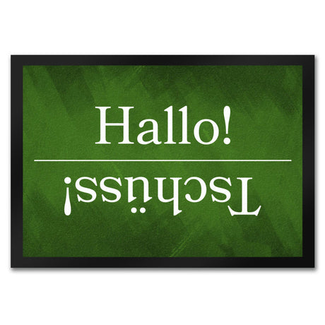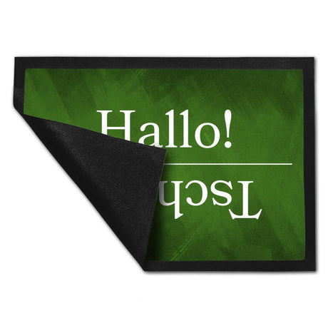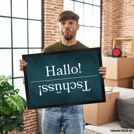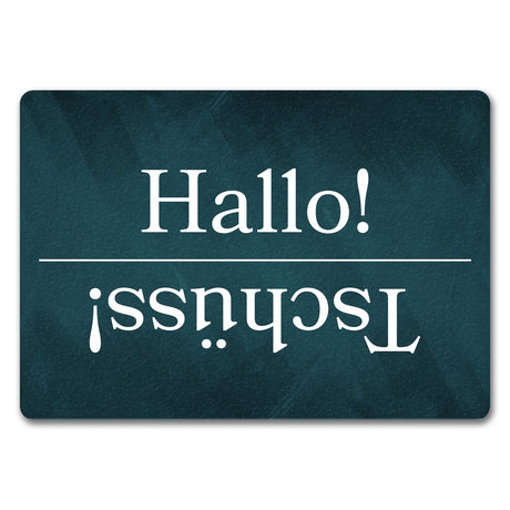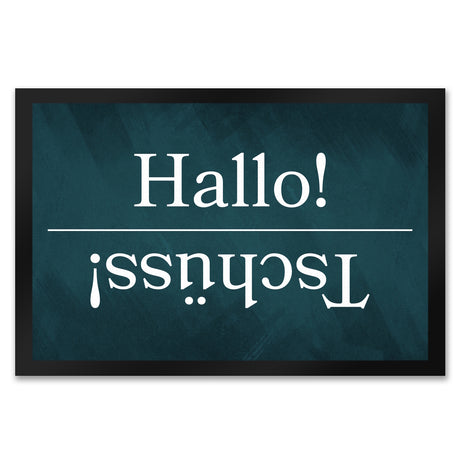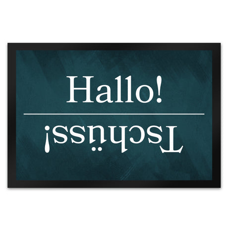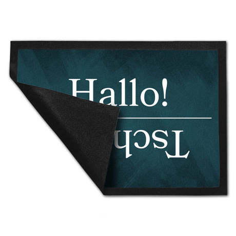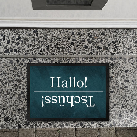 Hallo und Tschüss Fußmatte auf türkisfarbenem Hintergrund