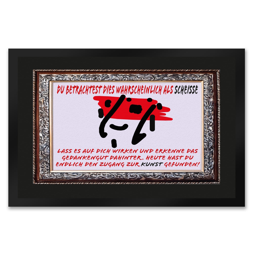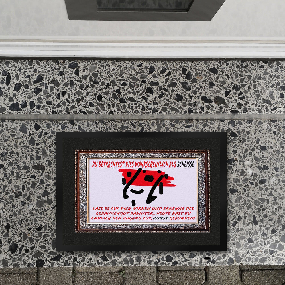 - Diese Fußmatte ist kein gewöhnlicher Schuhabtreter! Mit einem abstrakten Kopf im Bilderrahmen und einem frechen Spruch lädt sie dazu ein, sich selbst und die moderne Kunst kritisch zu hinterfragen. Ein bisschen verrückt, ein bisschen frech – genau das, was dein Eingangsbereich braucht!