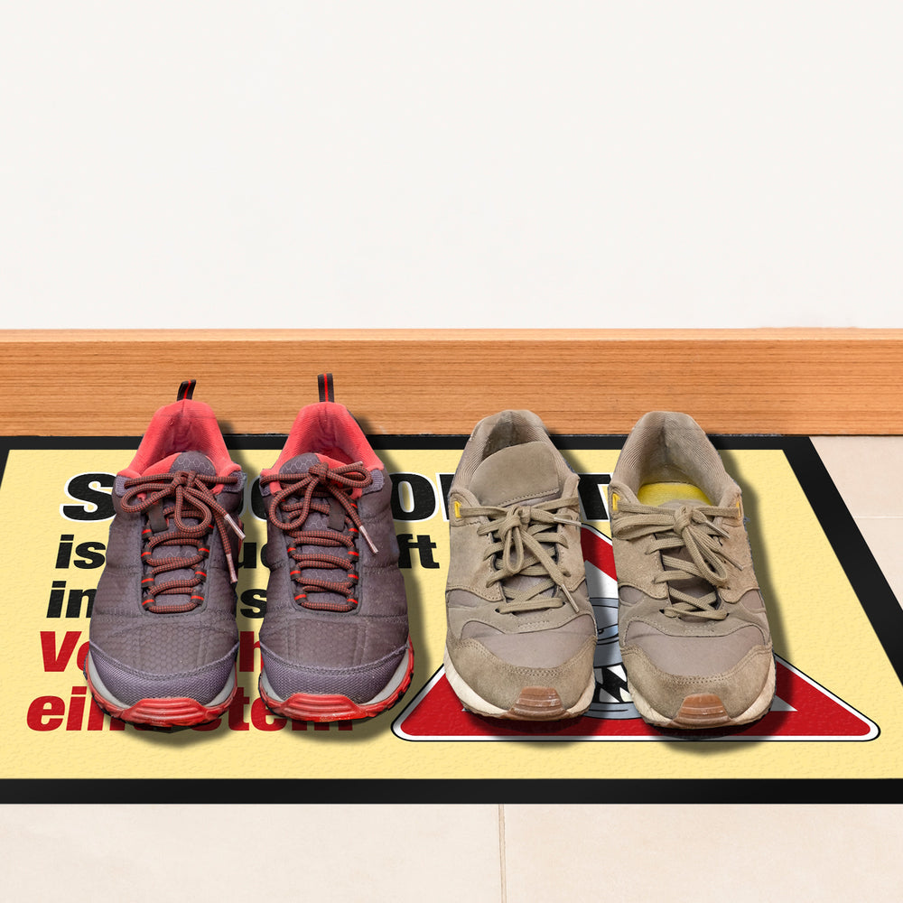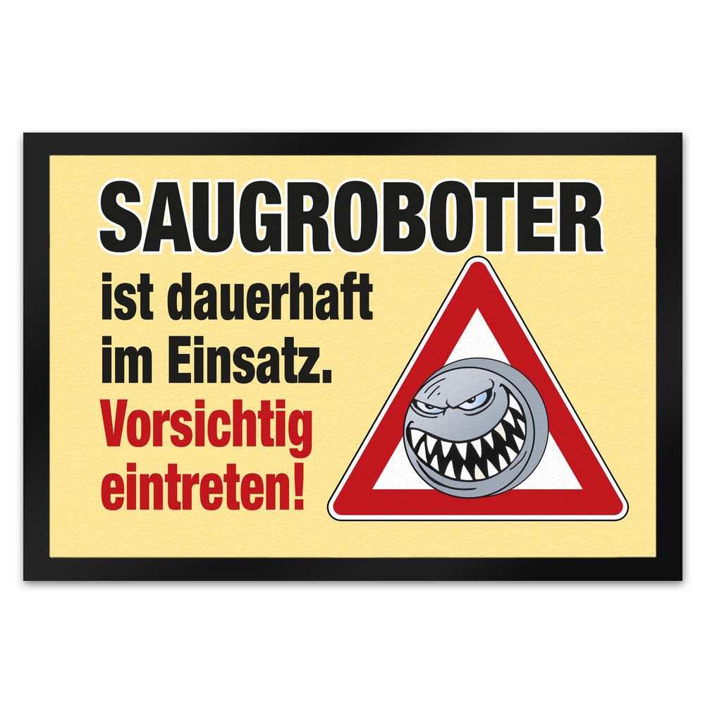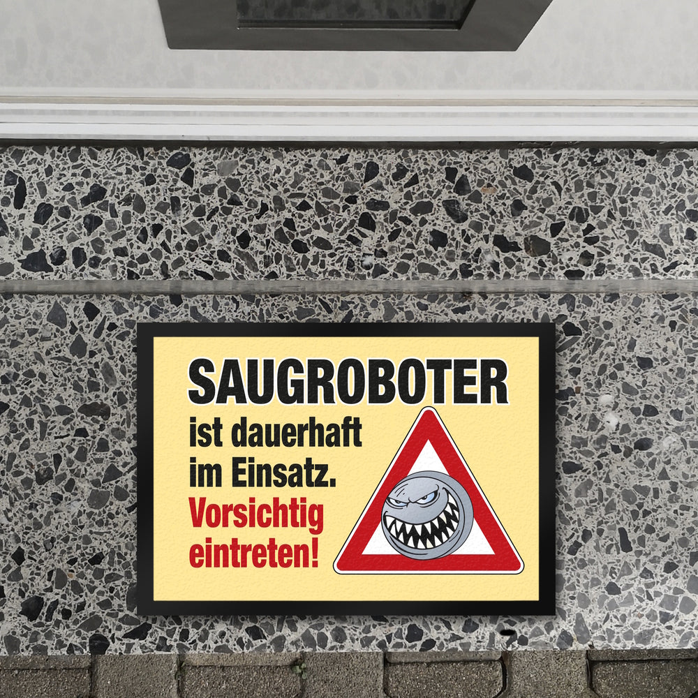 Saugroboter im Einsatz Fußmatte mit Spruch Vorsichtig eintreten!