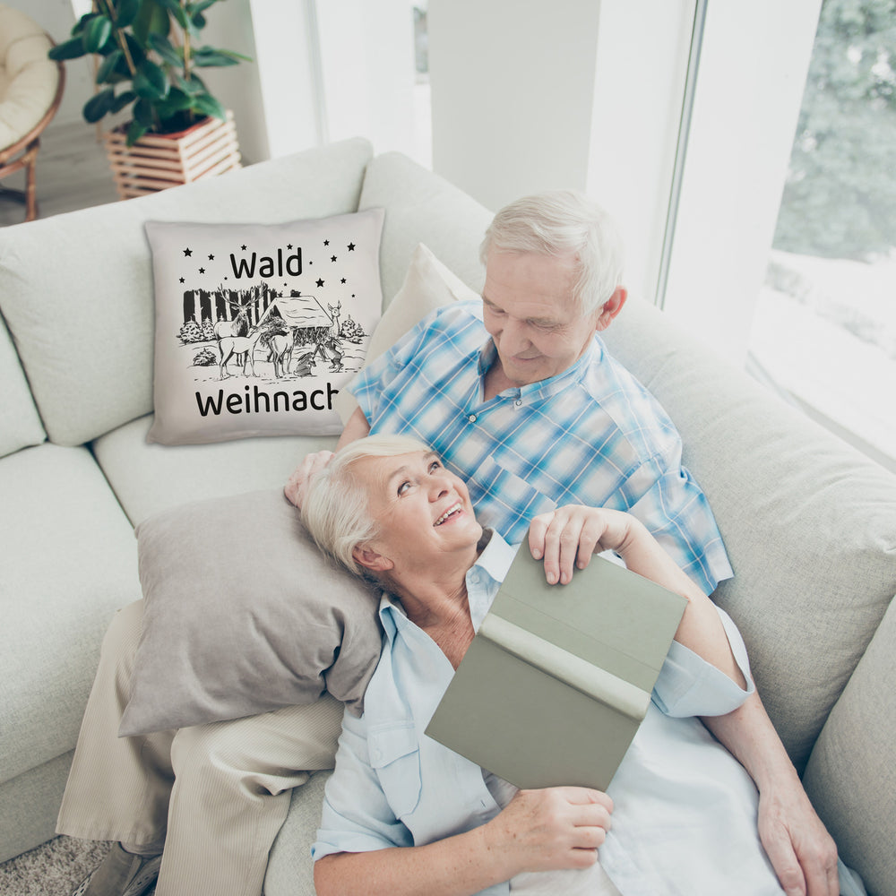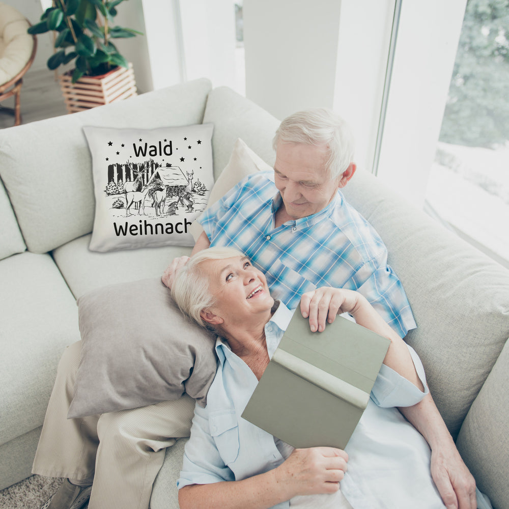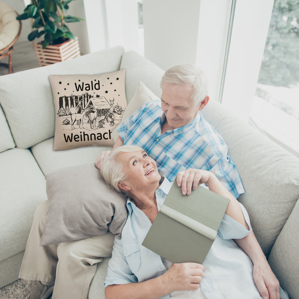Schnapp dir unser Waldweihnacht-Kissen und bringe ein Lächeln auf die Gesichter deiner Freunde und Familie. Verwandle dein Zuhause in eine kuschelige Winterwunderlandschaft mit dieser entzückenden Weihnachtsdeko, die sogar Santa vor Neid erblassen lässt! Unser Kissen nimmt dich mit auf eine Reise in einen zauberhaften Winterwald voller charmanter Waldtiere und einer heimeligen Futterkrippe. Ob für festliche Filmabende oder einfach zum gemütlichen Relaxen – dieses Kissen ist dein ultimativer Wohlfühlpartner.Verfügbar in ausgefallenen Stilen: Wähle zwischen satiniertem Hochglanz, kuschelweichem Plüsch oder edler Leinenoptik und finde deinen Favoriten. In unserer deutschen Kissen-Manufaktur mit Liebe gefertigt, verspricht jedes Kissen höchste Qualität und Detailverliebtheit.Verwende das Kissen als magischen Blickfang auf dem Sofa oder als herzliches Geschenk für Naturliebhaber und Weihnachtsromantiker. Mit der Aufschrift „Waldweihnacht“ weckt es nostalgische Winterfreuden und lädt dazu ein, die ruhigen Momente der Natur zu genießen.Unser Waldweihnacht-Kissen ist nicht nur ein dekoratives Highlight und perfekter Rückzugsort, sondern auch eine Einladung, die funkelnde Magie der Festtage in vollen Zügen zu genießen. Teilen Sie diesen Zauber mit Ihren Liebsten!