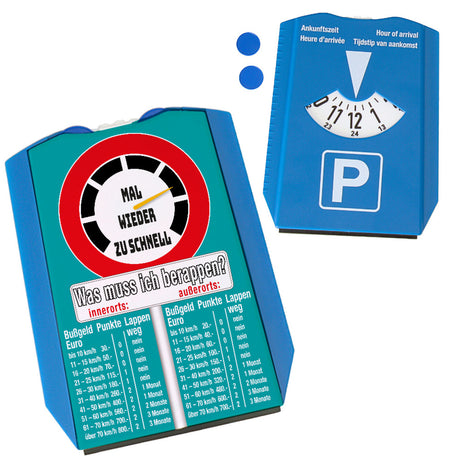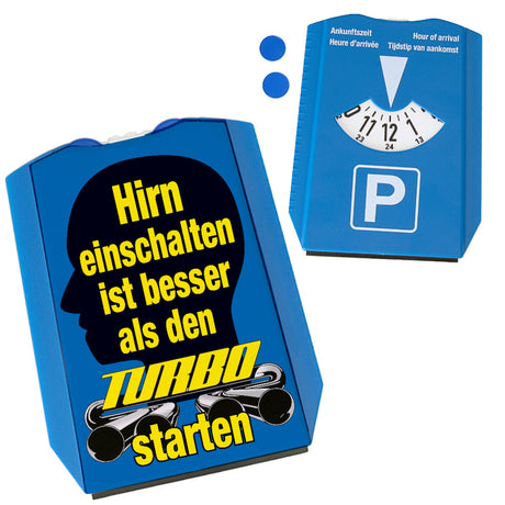 Ab €8,95Grundpreis /Nicht verfügbarAuf LagerRaser Parkscheibe mit Turbo Motiv in Blau-Gelb mit 2 Einkaufswagenchips