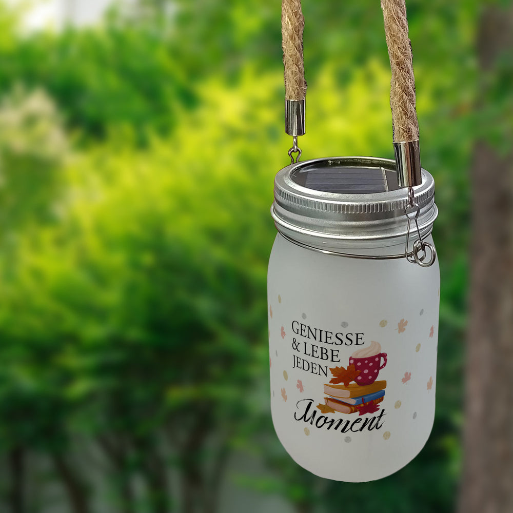 Erlebe jeden Moment mit dem „Genieße und lebe jeden Moment“ Solarlicht und tauche deine Wohnräume in gemütliches Licht. Mit einem nostalgischen Strick- oder Tauhenkel und einem Einmachglas Design, das eine rote Tasse auf Büchern und buntem Herbstlaub umgeben von leuchtenden Punkten im Hintergrund zeigt, ist diese Lampe nicht nur ein funktionelles Produkt, sondern auch ein kunstvolles Dekorationsobjekt. Der Deckel verarbeitete Lichterkette mit 40 LEDs lädt sich im Sonnenlicht auf und leuchtet bis zu 12 Stunden in der Dunkelheit. Mit dem Aufhängeseil ist die Lampe outdoor geeignet. Benötigt 1x AAA-Akku (nicht im Lieferumfang). Dieses Solarlicht macht das perfekte Geschenk für alle Bücherliebhaber und Teegenießer und erinnert uns daran, den Augenblick zu genießen. Bereicher dein Zuhause oder das eines geliebten Menschen mit dieser Lampe - es ist zu einem erschwinglichen Preis erhältlich!