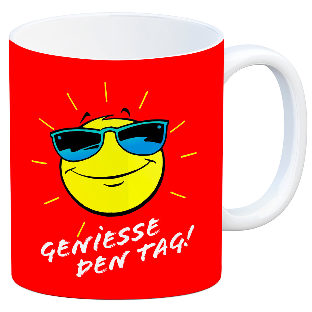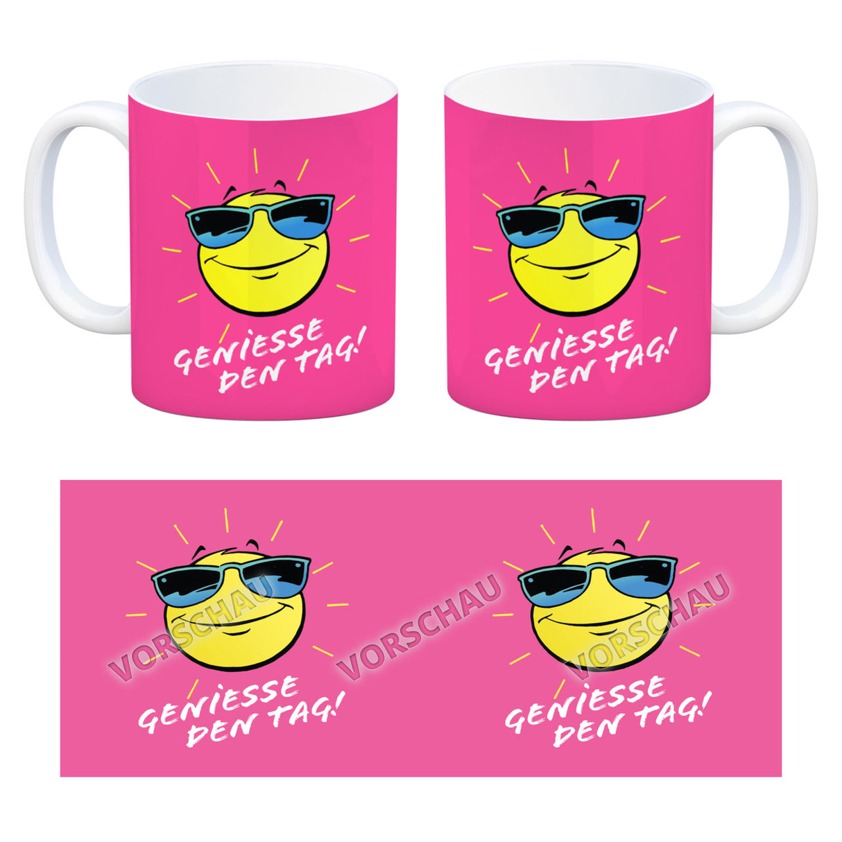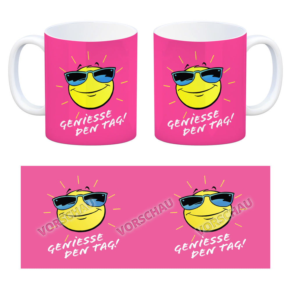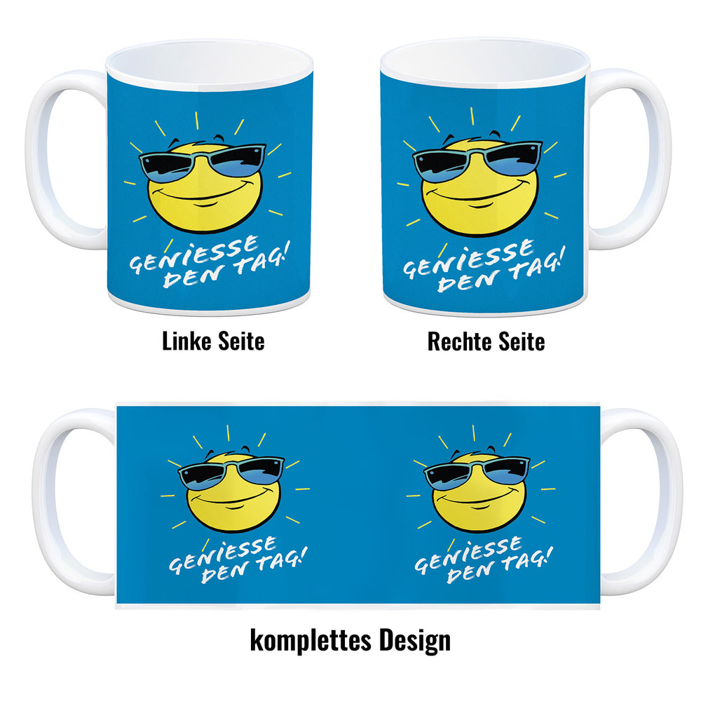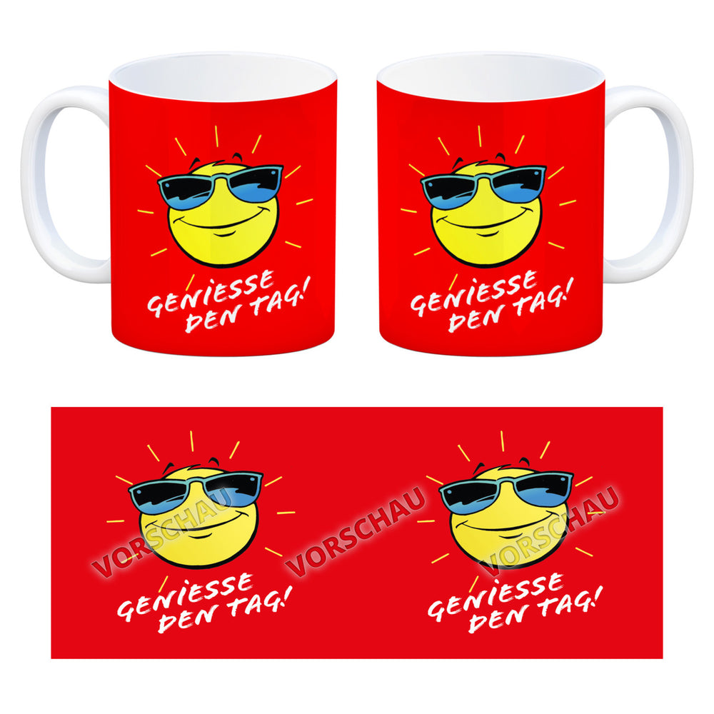 - 1x Geniesse den Tag! Kaffeebecher mit strahlender Sonne in der gewählten Ausführung