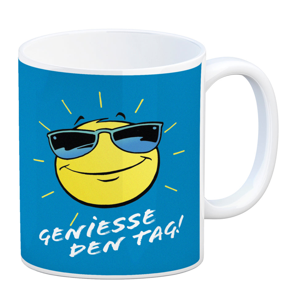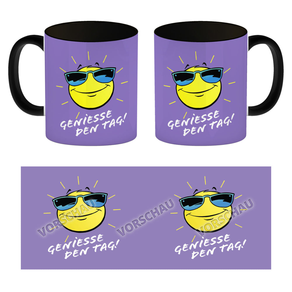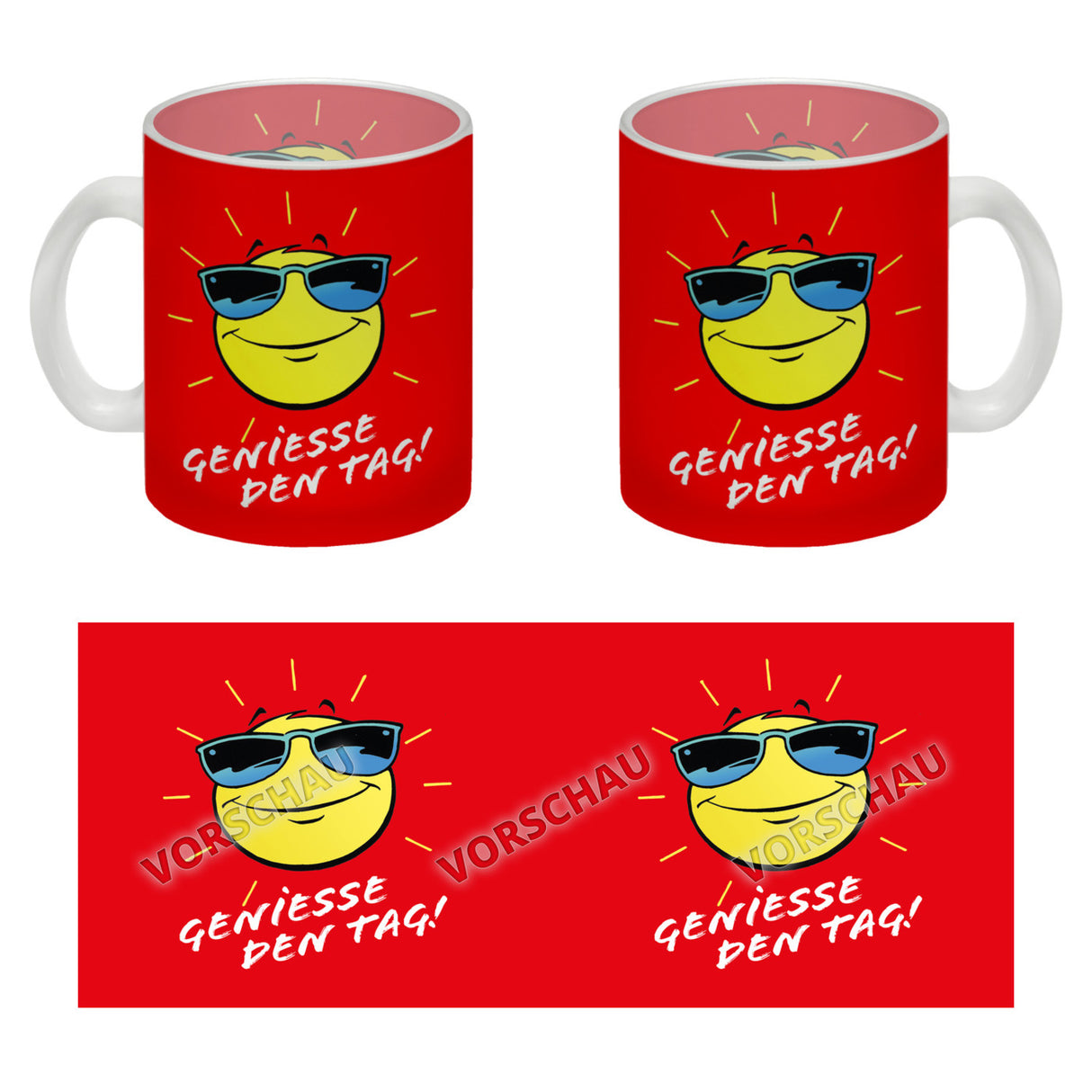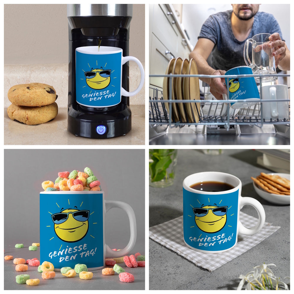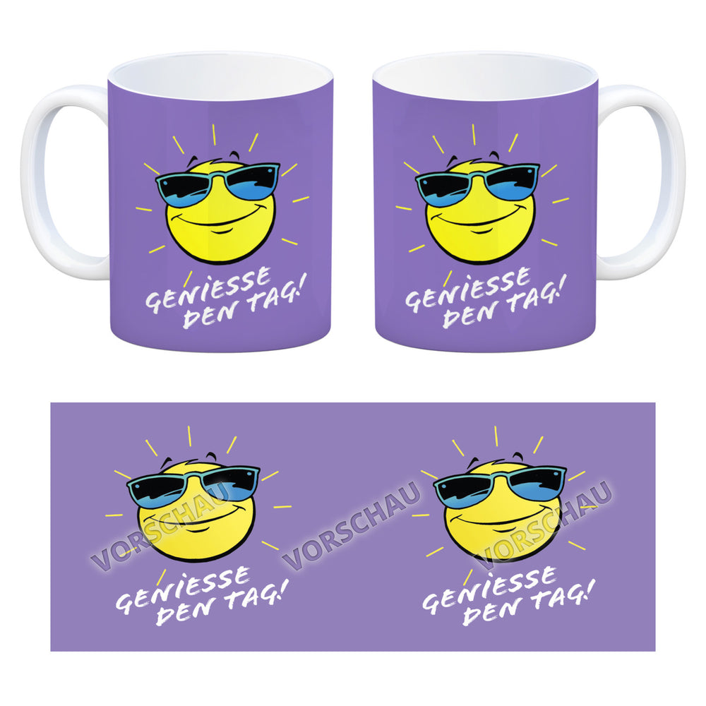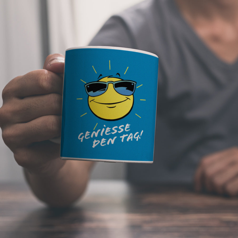 - 1x Geniesse den Tag! Kaffeebecher mit strahlender Sonne in der gewählten Ausführung