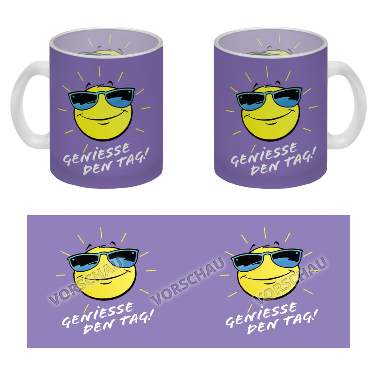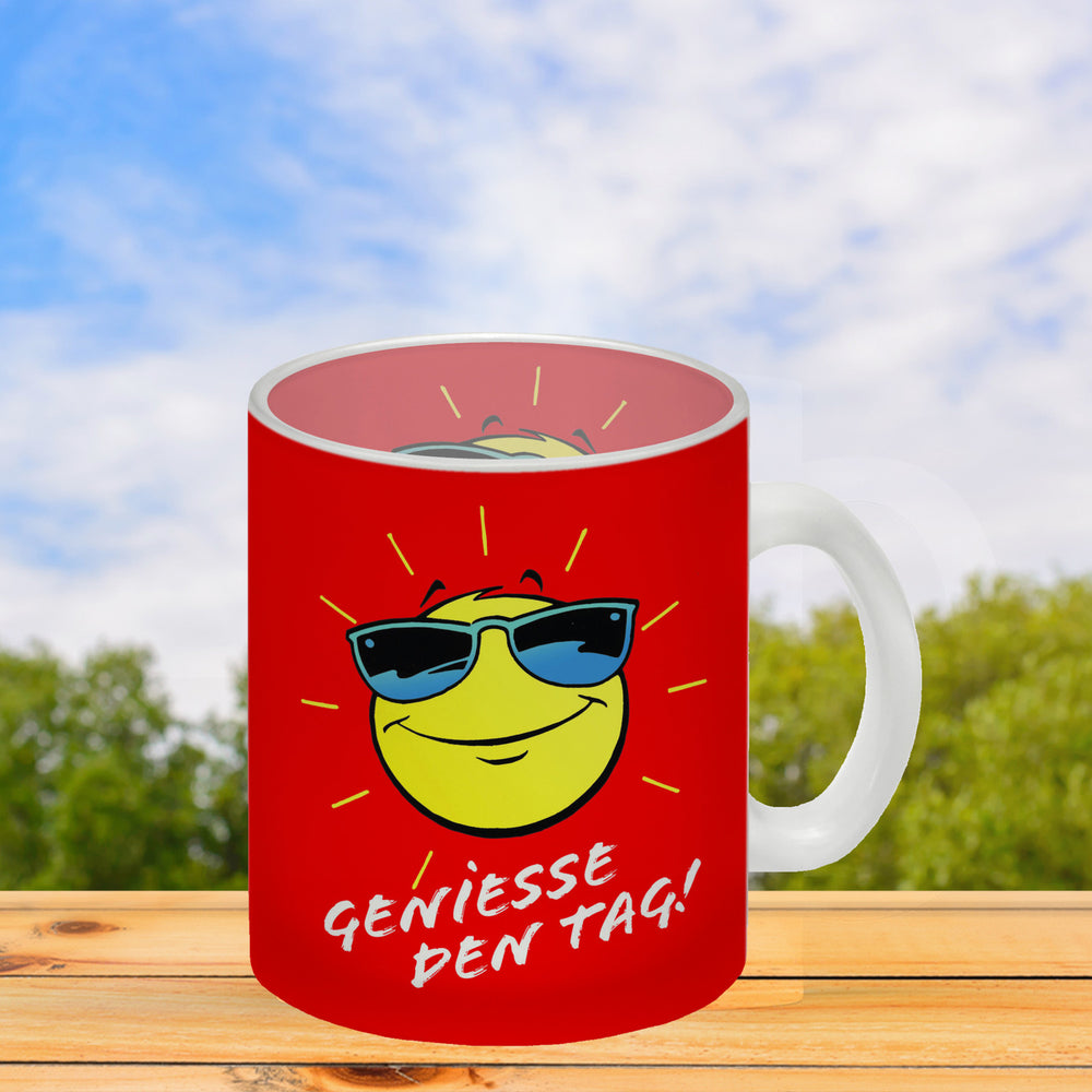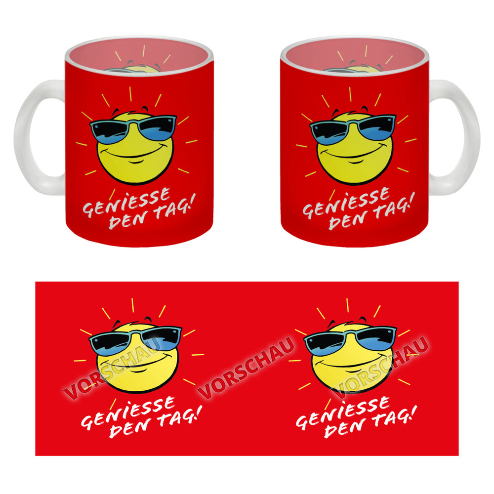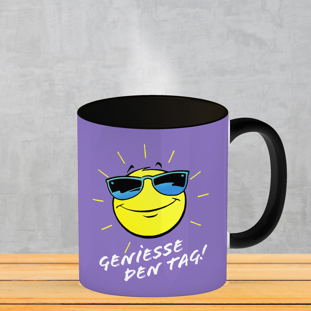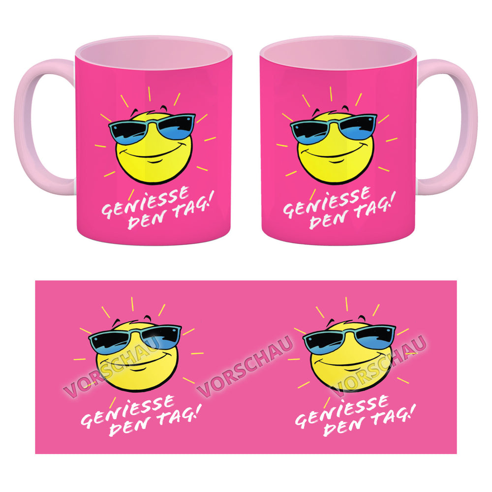 - 1x Geniesse den Tag! Kaffeebecher mit strahlender Sonne in der gewählten Ausführung