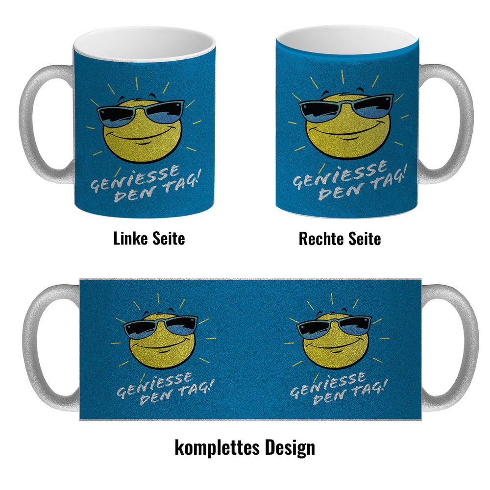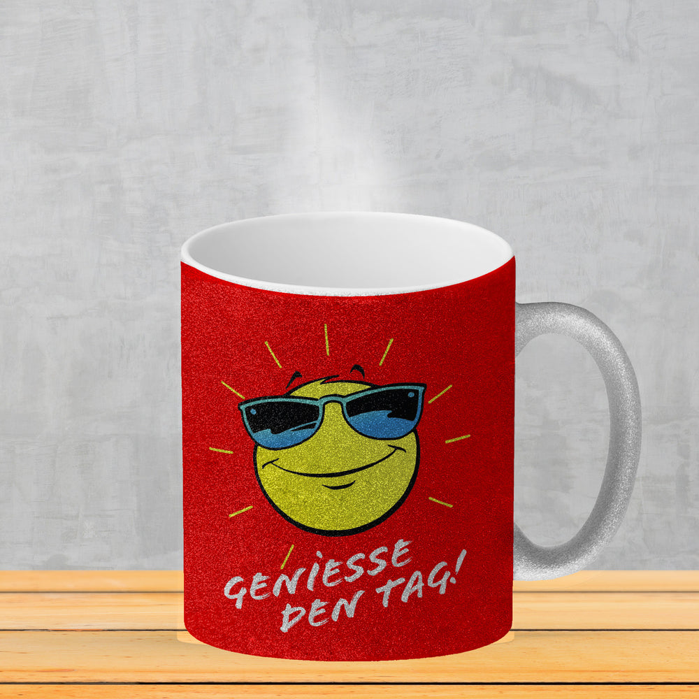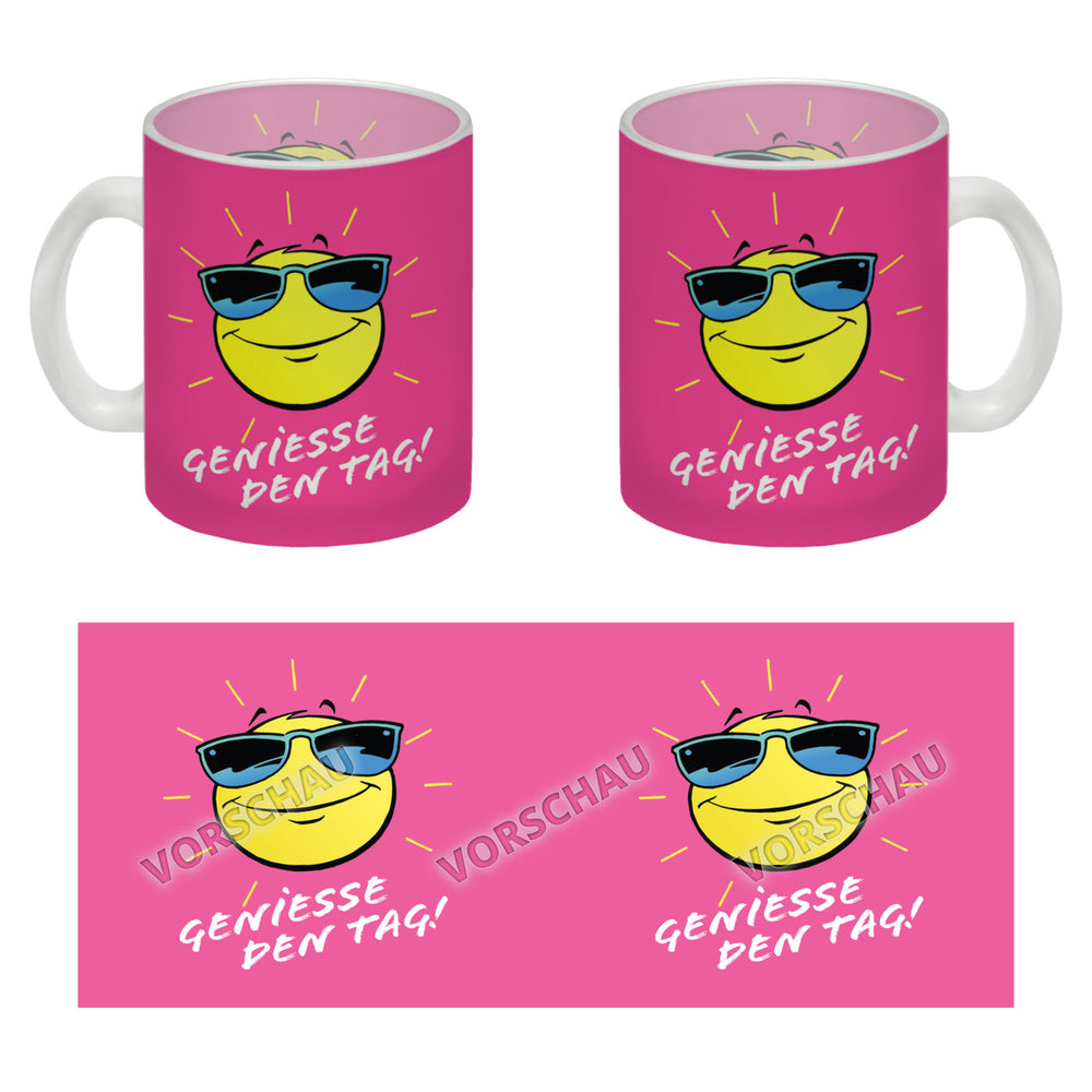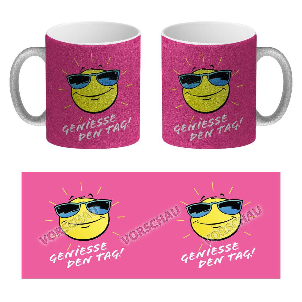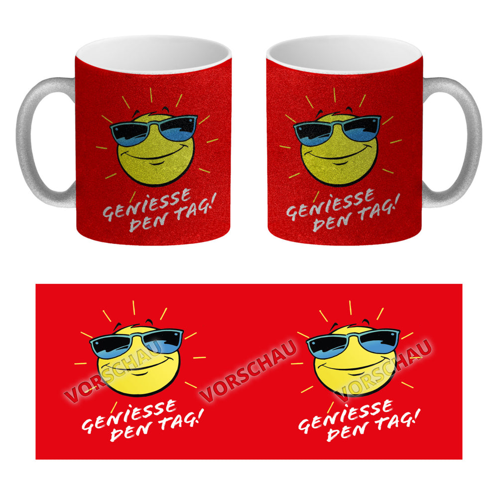 - 1x Geniesse den Tag! Kaffeebecher mit strahlender Sonne in der gewählten Ausführung