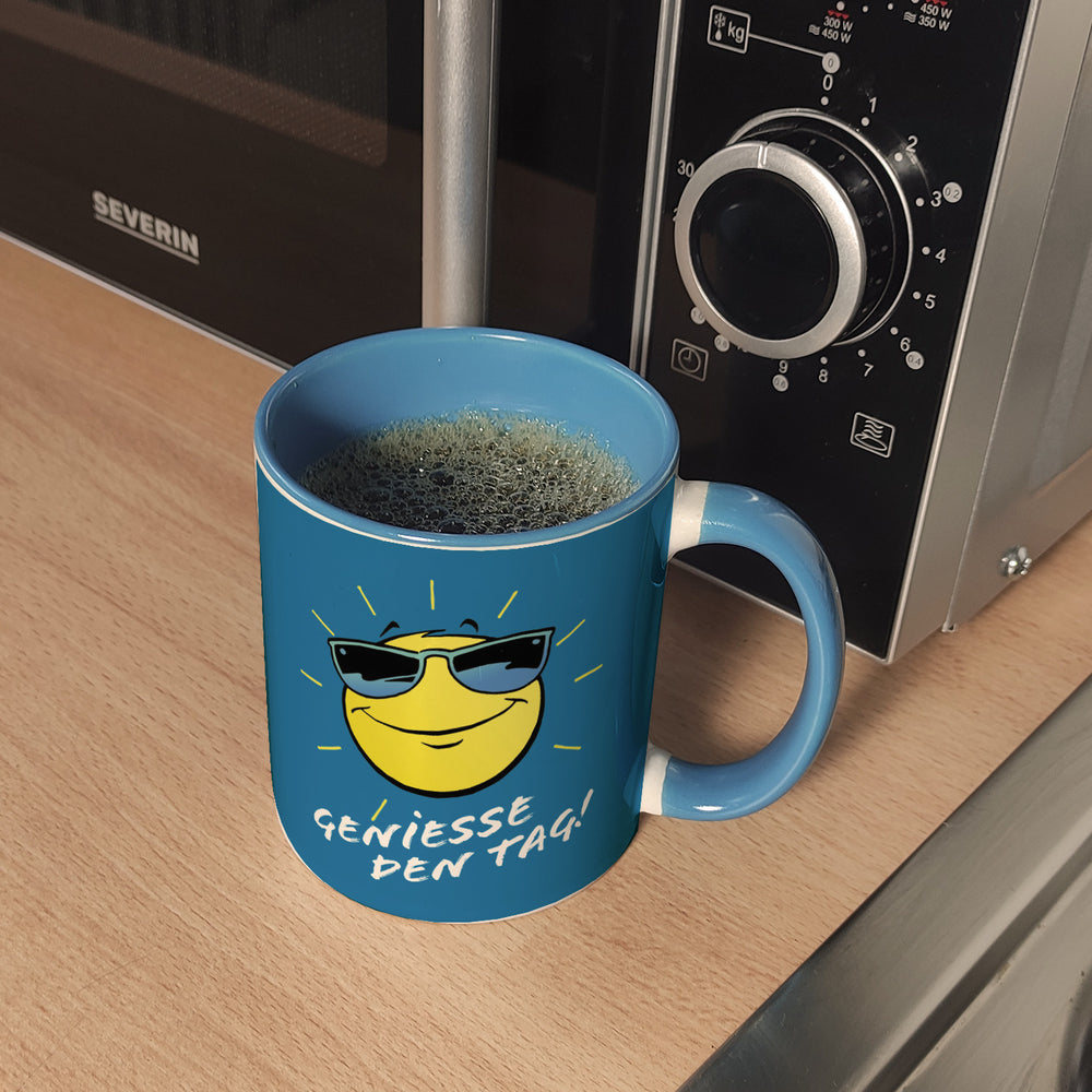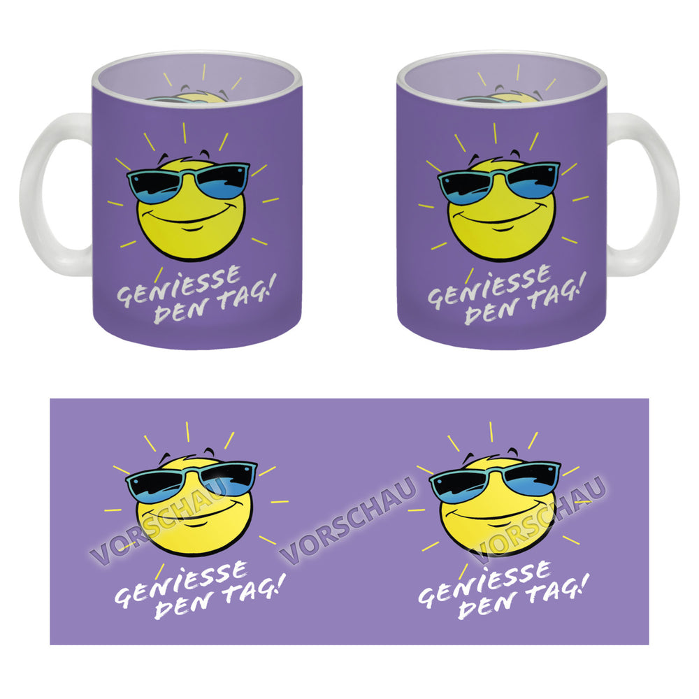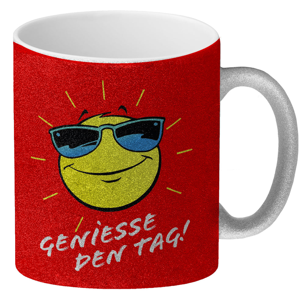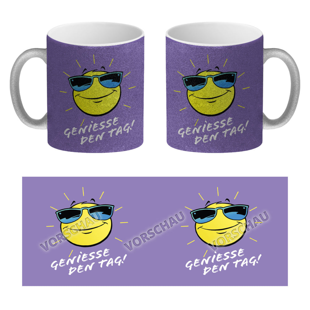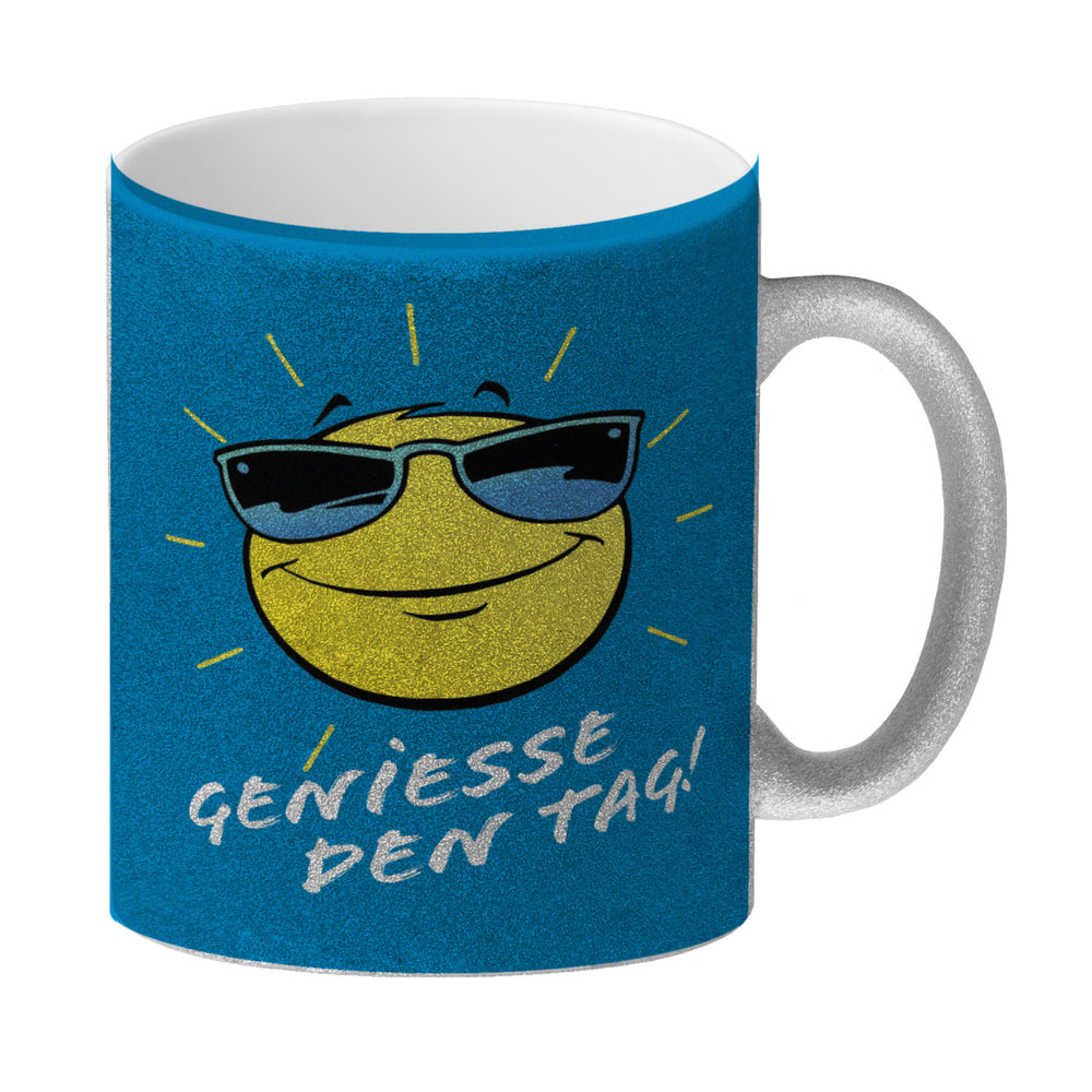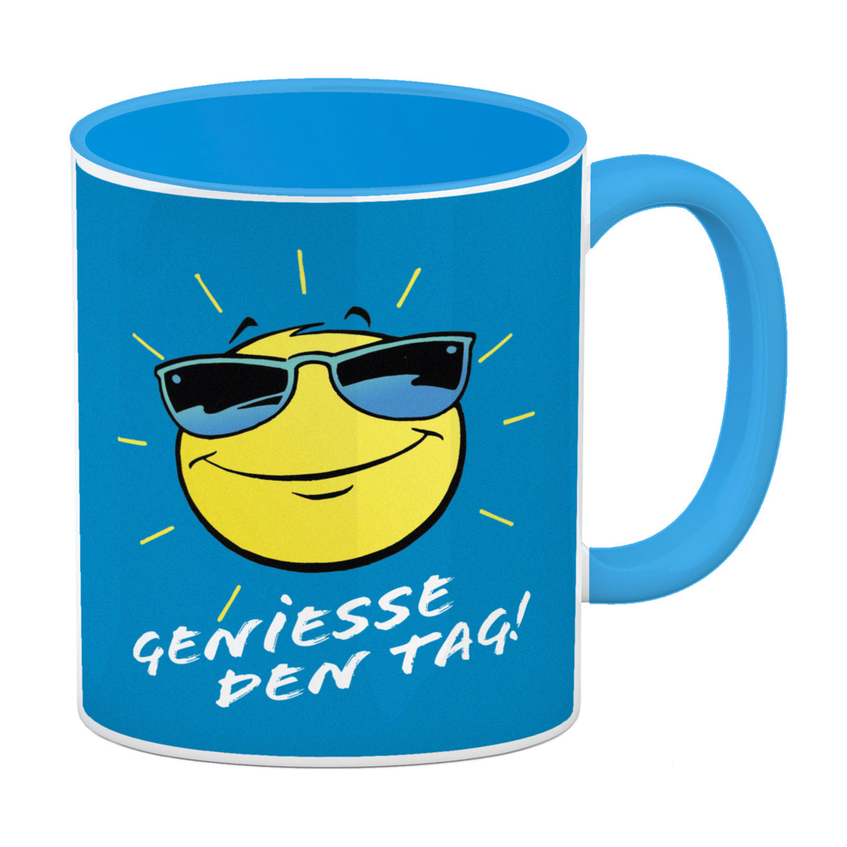 - 1x Geniesse den Tag! Kaffeebecher mit strahlender Sonne in der gewählten Ausführung