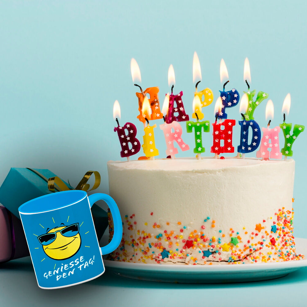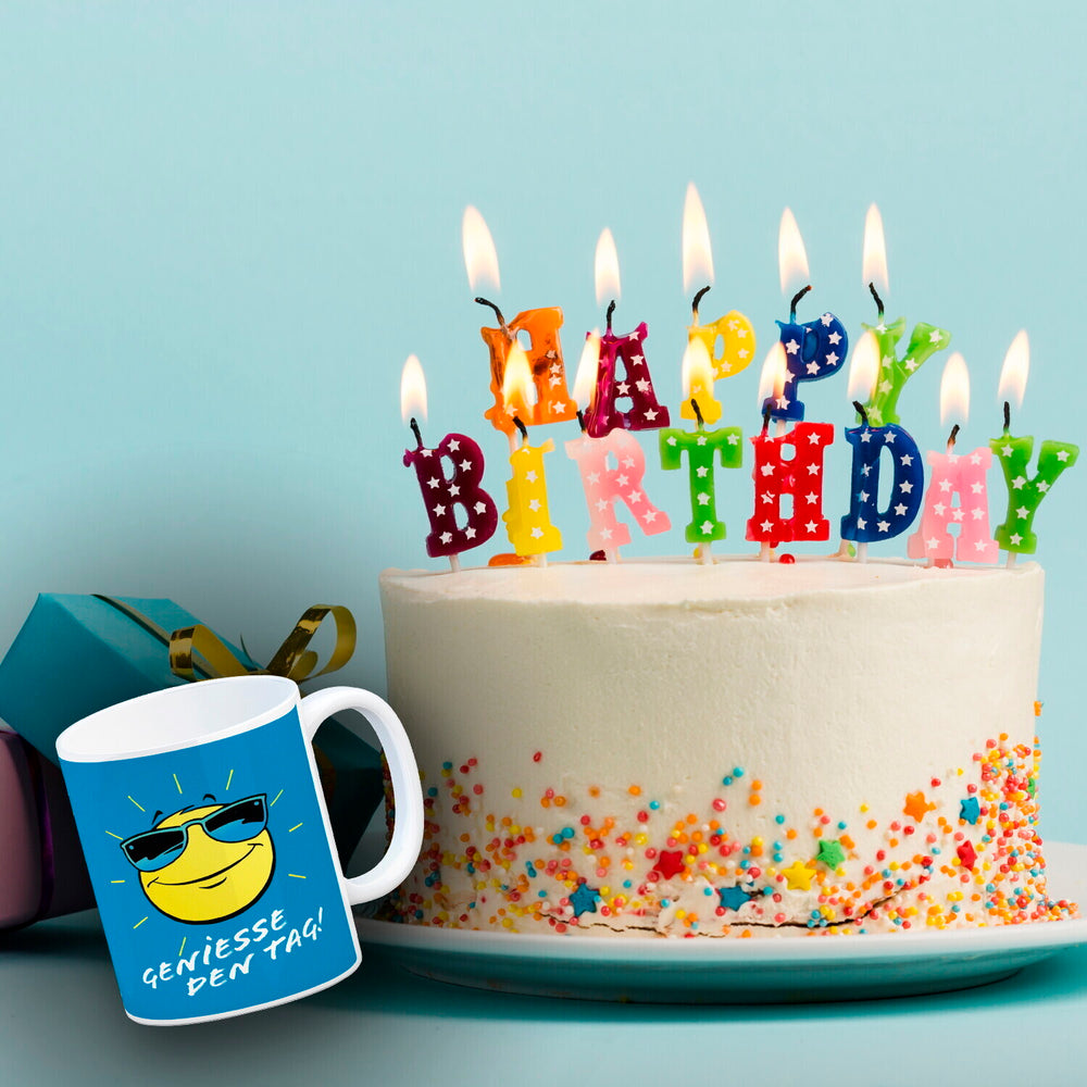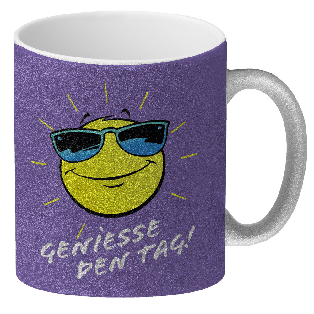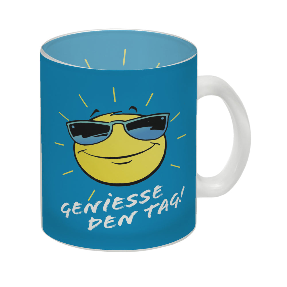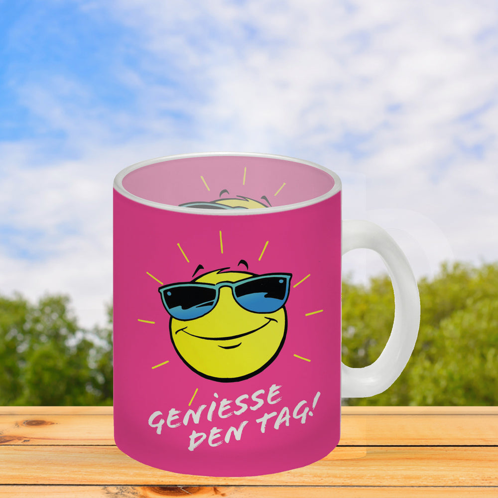 - 1x Geniesse den Tag! Kaffeebecher mit strahlender Sonne in der gewählten Ausführung