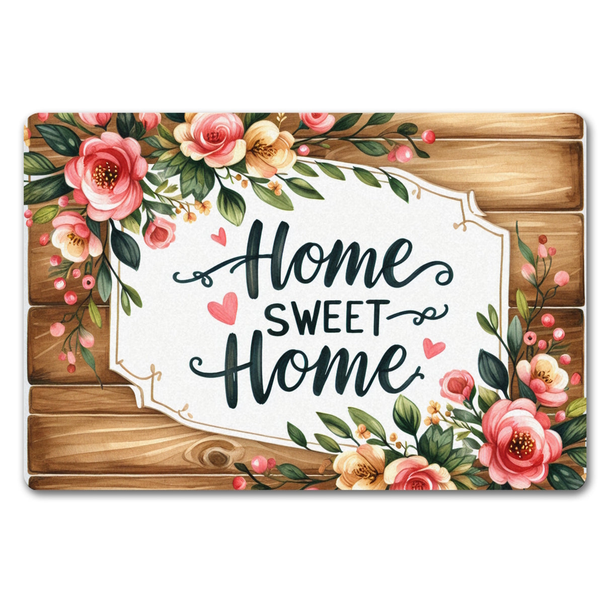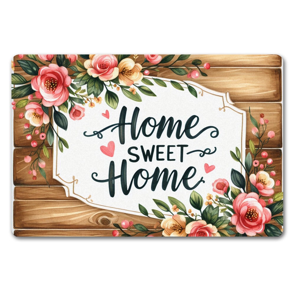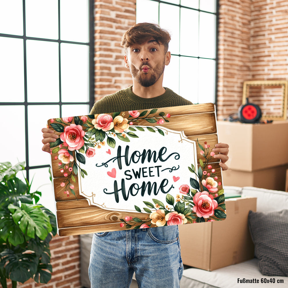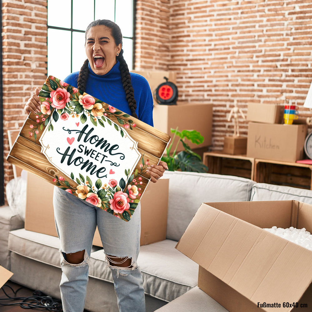 - Willkommen in der Wohlfühloase! Unsere "Home sweet Home" Fußmatte begrüßt dich und deine Gäste mit offenen Armen, oder besser gesagt, mit offenen Buchstaben. Mit ihrem rustikalen Holzhintergrund und den blumigen Akzenten schafft sie eine sofortige Gemütlichkeit direkt an deiner Türschwelle.