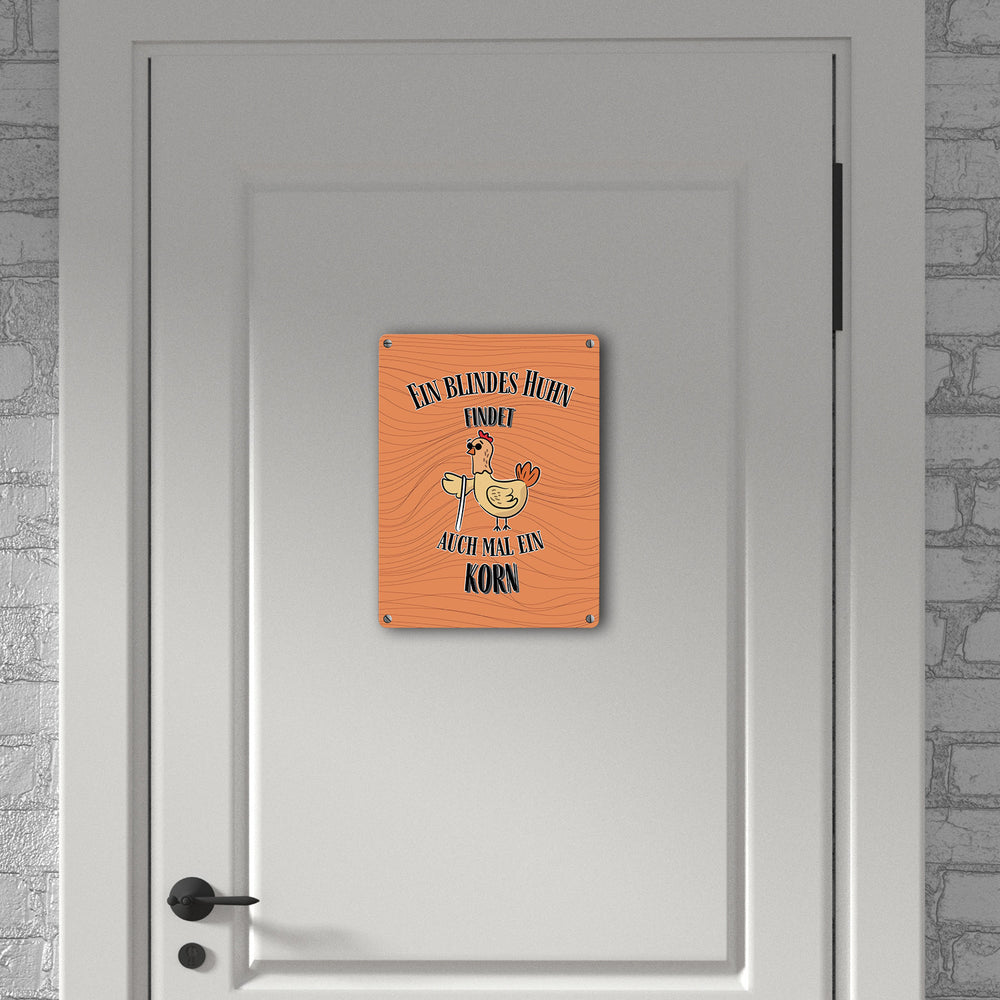 - Mit dem witzigen Metallschild mit dem Motiv „Ein blindes Huhn findet auch mal ein Korn“ ist es möglich, jemanden ganz besonderen zu überraschen. Der Spruch des Schilds erinnert uns daran, dass man nie aufgeben sollte und am Ende immer seine Belohnung bekommen wird.