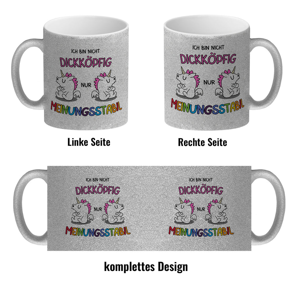 Einhorn-Liebhaber aufgepasst! Mit diesem witzigen Kaffeebecher triffst du garantiert ins Schwarze. Der Becher ist eine perfekte Geschenkidee für alle Einhorn-Fans und besonders zum Geburtstag ein Highlight. Der Spruch „Ich bin nicht dickköpfig, nur meinungsstabil“ bringt jeden zum Schmunzeln und ist eine tolle Erinnerung an deine Meinungsstärke. Unser Einhorn-Kaffeebecher ist in verschiedenen Varianten erhältlich: Als weiße Standardtasse, mit farbigem Henkel und Innenseite, als edle Glastasse oder in der exklusiven Silberedition mit Glitzereffekt. Jede Tasse wird mit viel Liebe zum Detail in unserer Tassen-Manufaktur hergestellt. Greif jetzt zu und schenke deinen Lieben einen Kaffeebecher mit Einhorn-Motiv, der an die Wichtigkeit des Ausdrucks persönlicher Meinungen erinnert!
