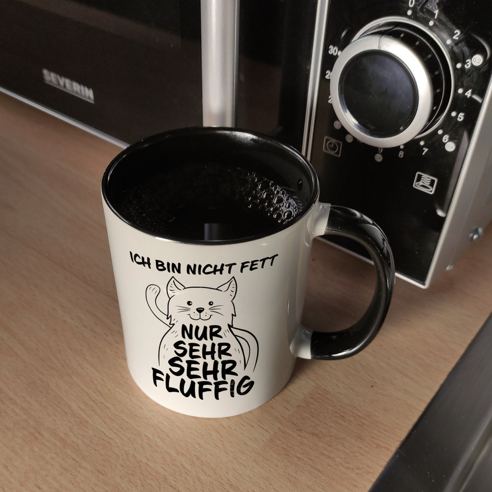 Katzen Kaffeebecher mit Spruch Ich bin nicht dick, nur fluffig