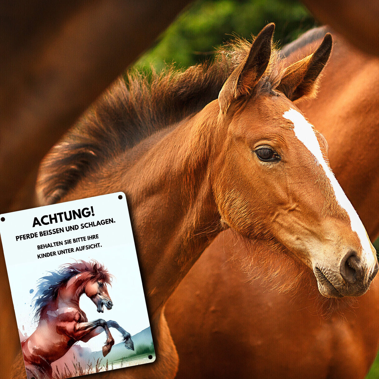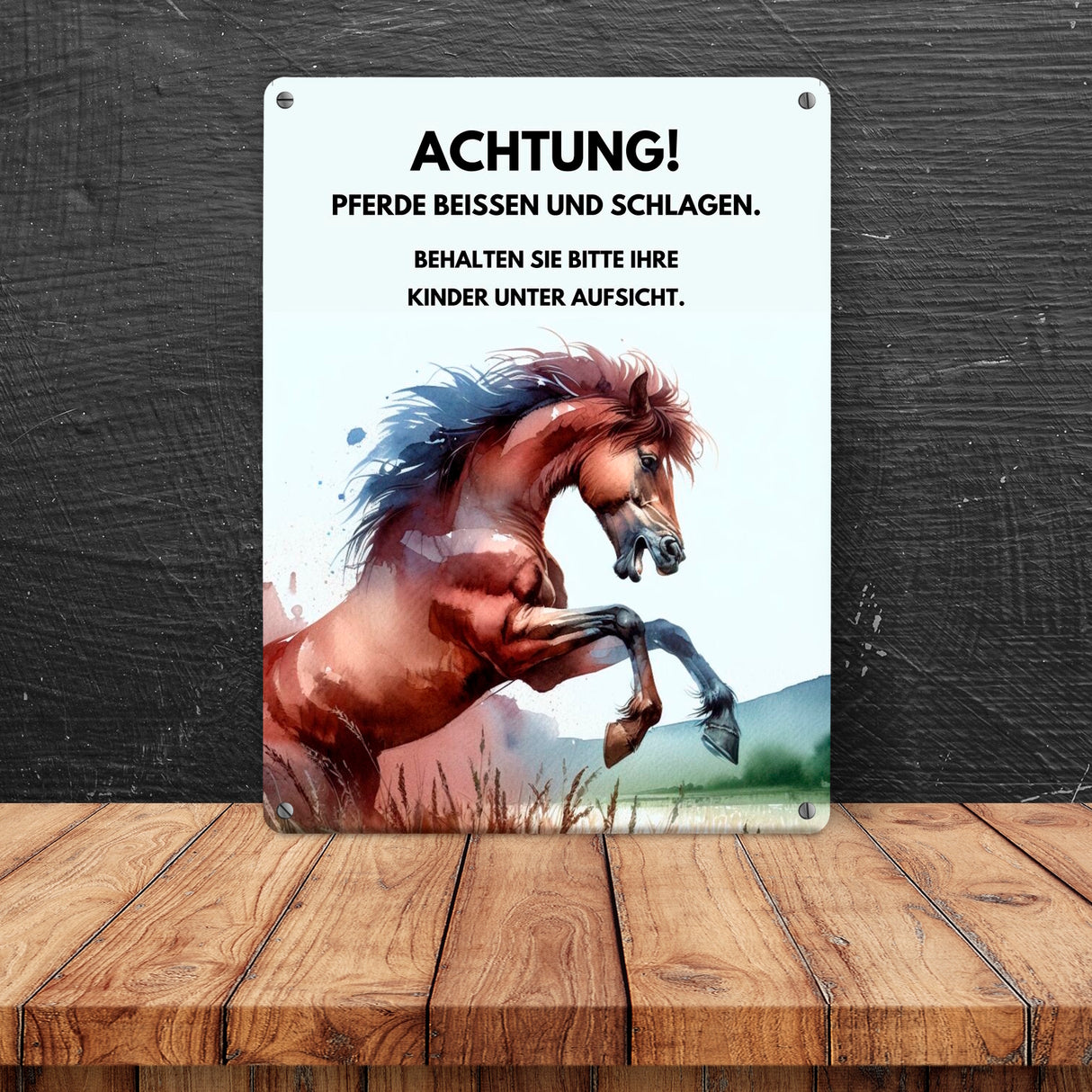 Hoch das Bein und aufgepasst, liebe Pferdefreunde! Unser Vorsicht Pferde können beißen und schlagen -Metallschild ist der Stern am Stalltor-Himmel und der Wächter jeder Weide. Egal ob Sie ein Pferdeparadies besitzen oder einfach vor dem tierischen Temperament warnen möchten – dieses Schild verkündet mit einem Augenzwinkern, was jeder Pferdekompagnon wissen muss.In handlicher Größe von 15x20 cm komponiert, mit hochwertigem Aluminiumblech voller Charakter liebevoll in Deutschland bedruckt, kommt diese humorvolle Warnung daher. Anmutig wie ein Tanz auf der Weide und robust wie ein Hufschlag – unser Schild vereint Charme mit Notwendigkeit.Abgerundete Ecken und vorgebohrte Löchern machen die Montage zu einem Kinderspiel, während das Design selbst dem grimmigsten Postboten ein Lächeln entlocken wird. Stellen Sie sich vor, wie es glänzt und jeden Besucher charmant daran erinnert, das wunderschöne Wesen Pferd doch bitte mit der gebotenen Achtung und aus sicherer Distanz zu bewundern.Also, ob für Sie selbst oder als Geschenk für den Stallbetreiber, der glaubt, schon alles zu haben: Dieses Schild ist der beste Dialogstarter für jeden, der Tierliebe und humorvolle Sicherheitshinweise zu schätzen weiß. Schlagen Sie zu, denn dieses Schild hat Biss!