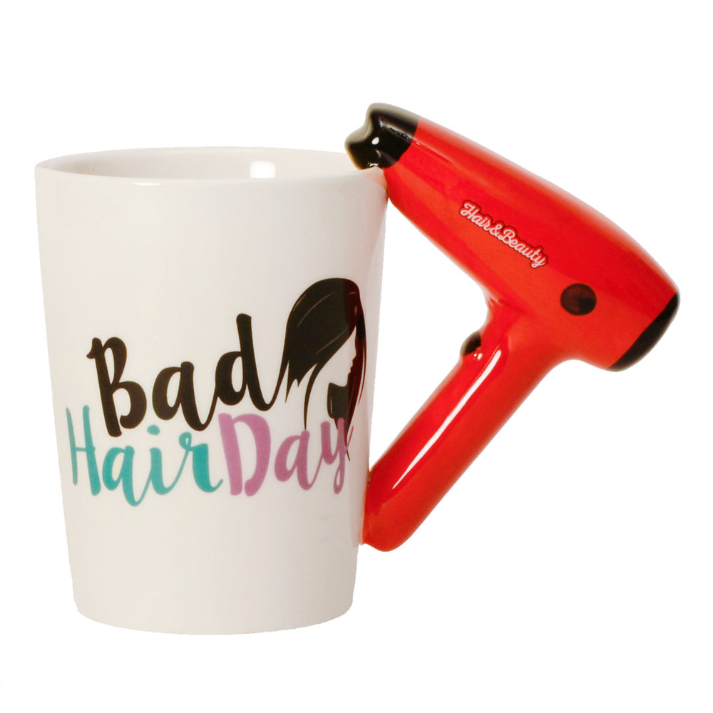 Einzigartige Tasse mit Föhn als Griff und dem coolen Spruch - Bad Hair Day. Material: Keramik | NICHT für die Benutzung in der Mikrowelle geeignet. Nur von Hand waschen - nicht für die Spülmaschine geeignet. Bitte vor dem ersten Gebrauch auswaschen.