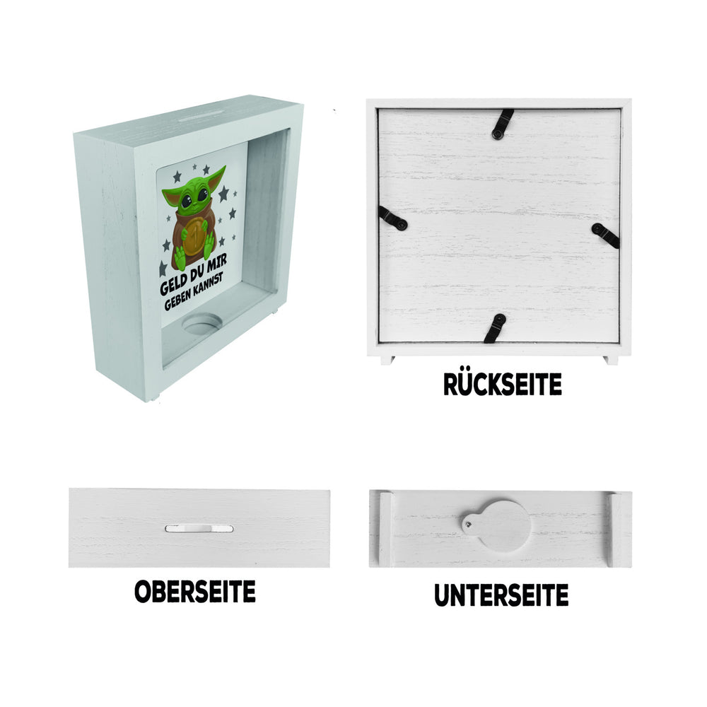 Mit dieser Baby-Alien Spardose mit Spruch Geld du mir geben kannst, hast du ein originelles Geschenk für Kindergeburtstage. Mit dem Motiv eines niedlichen Alien-Babys, das eine Münze in seinen Händchen hält, wird das Sparen zu einem unterhaltsamen Erlebnis. Diese Spardose ist sowohl als schlichte Holzspardose, als hochwertige ovale Keramik-Version oder als exklusive Rahmen-Variante aus Holz mit Sichtfenster erhältlich und sorgfältig in Deutschland bedruckt. Sie ist ein charmantes Accessoire, um Kindern den Umgang mit Geld spielerisch beizubringen und ihnen eine motivierende Erinnerung an den Wert des Sparens zu vermitteln. Ein Kauf, der sich auf vielfältige Weise lohnt!