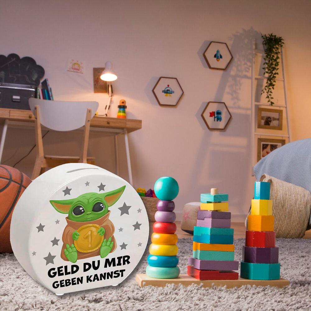 • Die Spardose mit Baby-Alien Motiv ist ein niedlicher Hingucker. Sie zeigt ein kleines Alien-Baby, das eine große Münze festhält, während kleine Sterne um es herum tanzen. Diese Spardose ist perfekt, um Kindern spielerisch den Umgang mit Geld beizubringen und den Grundstein fürs Sparen zu legen.