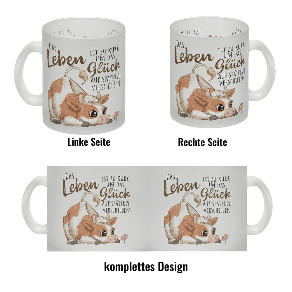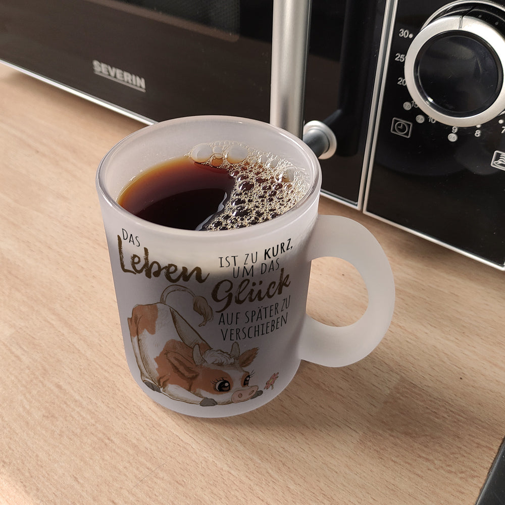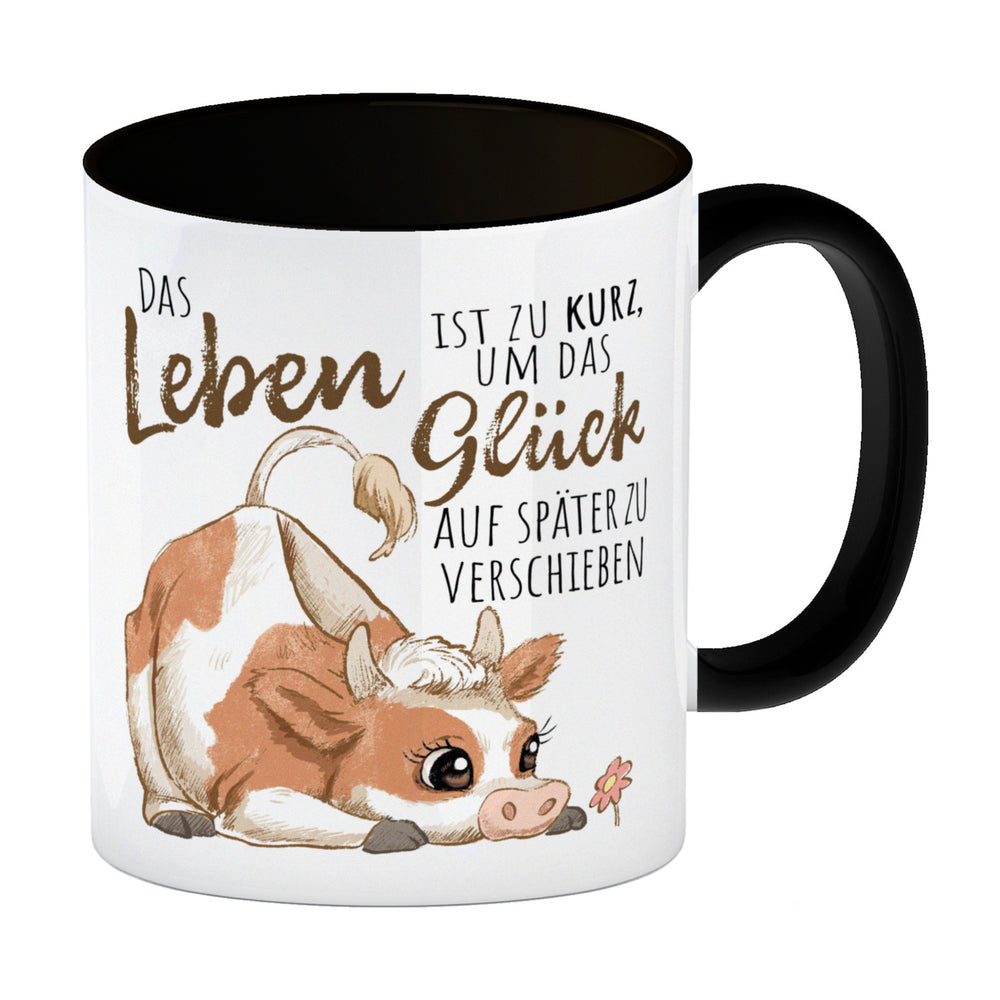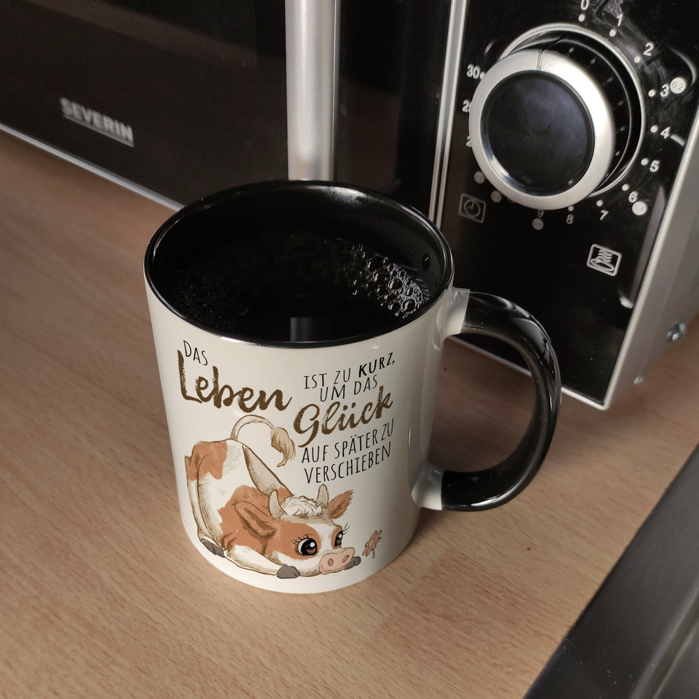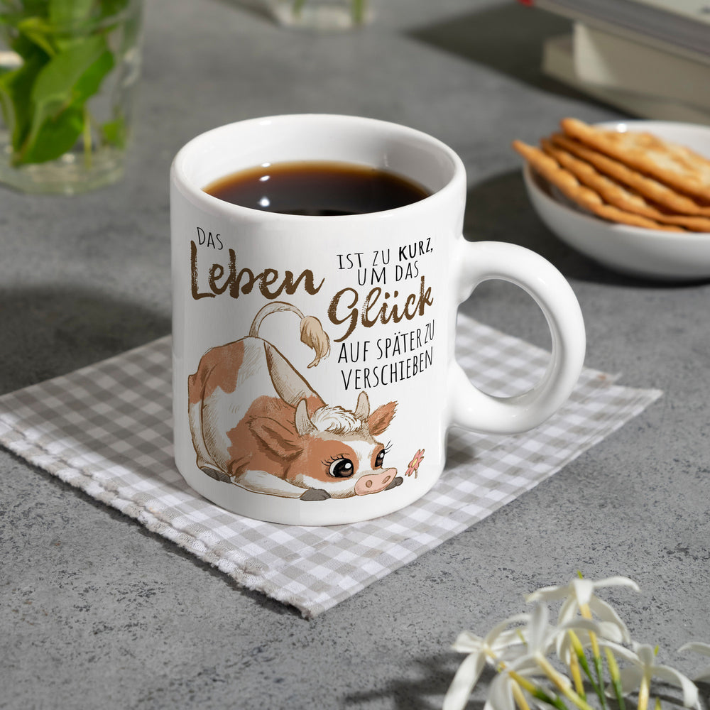 • 1x Kuh Kaffeebecher mit Spruch Das Leben ist zu kurz um das Glück zu verschieben in der gewählten Ausführung