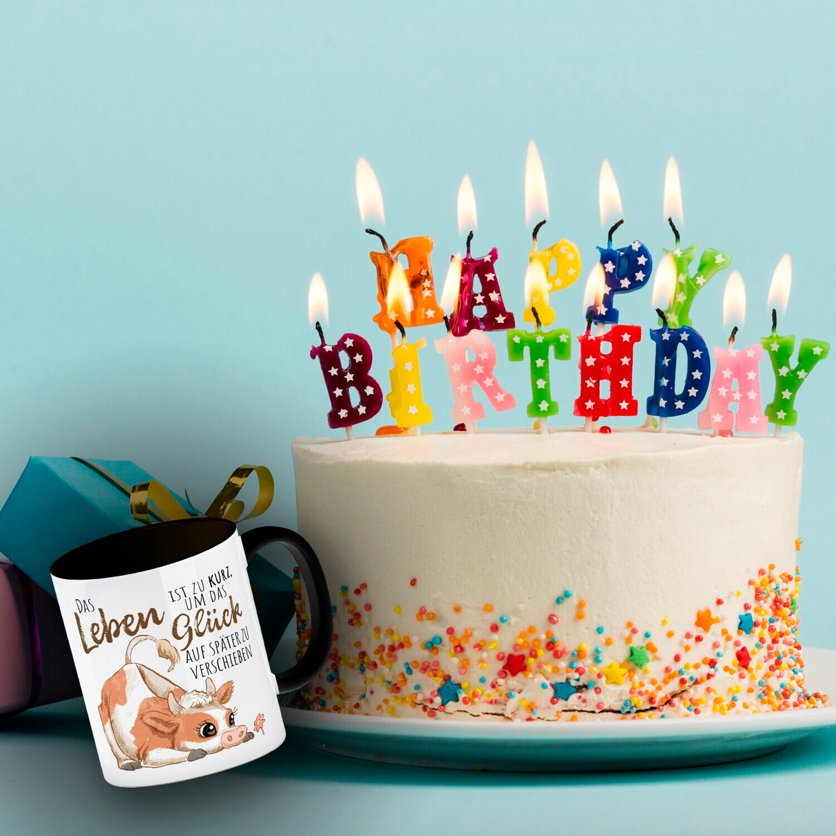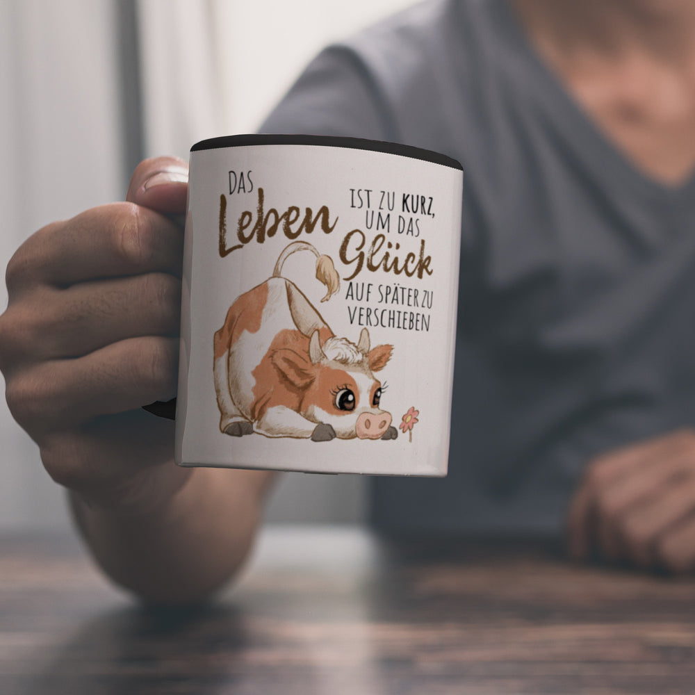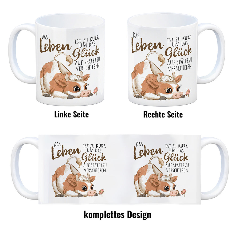 Kuh Kaffeebecher mit Spruch Das Leben ist zu kurz um das Glück zu verschieben