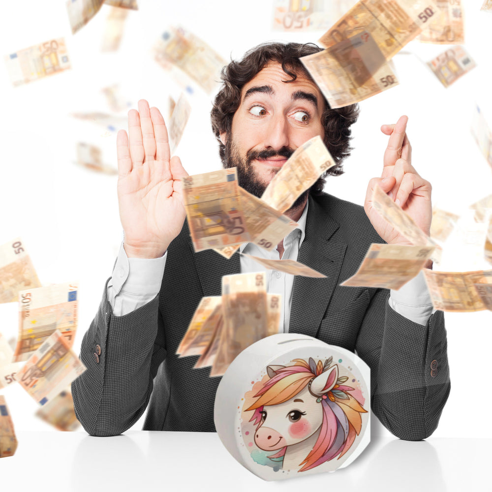 - "Bring Cowboy-Feeling ins Sparen! Mit einem 'Yeehaw!' schluckt unser Pferdchen deine Münzen und hält sie sicher fest. Dieses perfekte Pferdegeschenk ist das Must-have für pferdeverrückte Kids – ob als Geburtstagsschätzchen oder Taufgeschenk. Der Spruch 'Auf die Hufe, fertig, sparen!' lädt zum lustigen Geldsammeln ein. Also, worauf wartest du? Aufsatteln und sparen!"