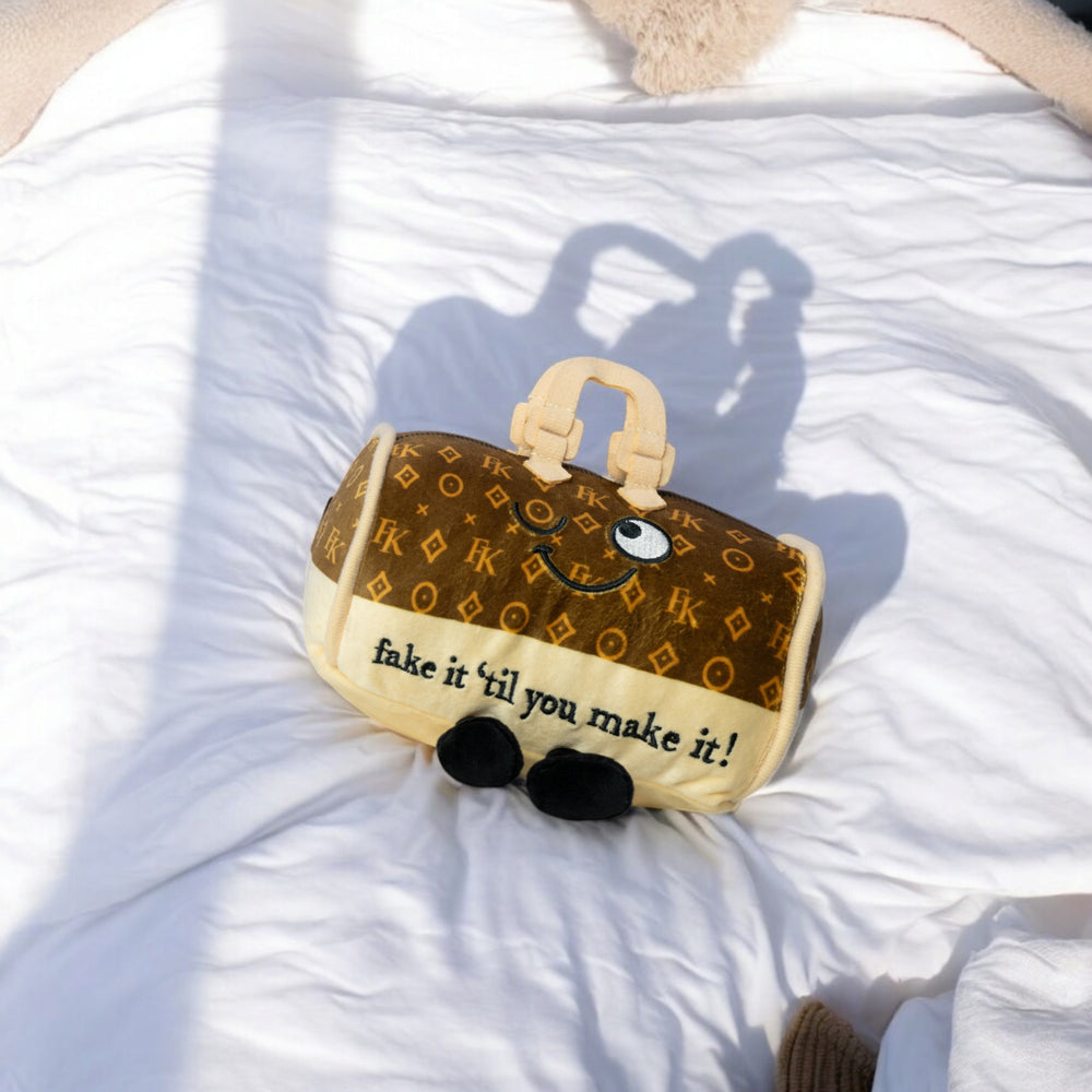 - Diese Designer-Handtasche ist kein gewöhnliches Plüschtier. Mit ihrem luxuriösen Look in braunen und beigen Tönen und einem frechen "Fake it till you make it"-Spruch bringt sie jeden zum Lachen. Ihre plüschigen Henkel und das grinsende Gesicht machen sie unwiderstehlich - fast zu schick, um sie nicht mit sich rumzutragen!