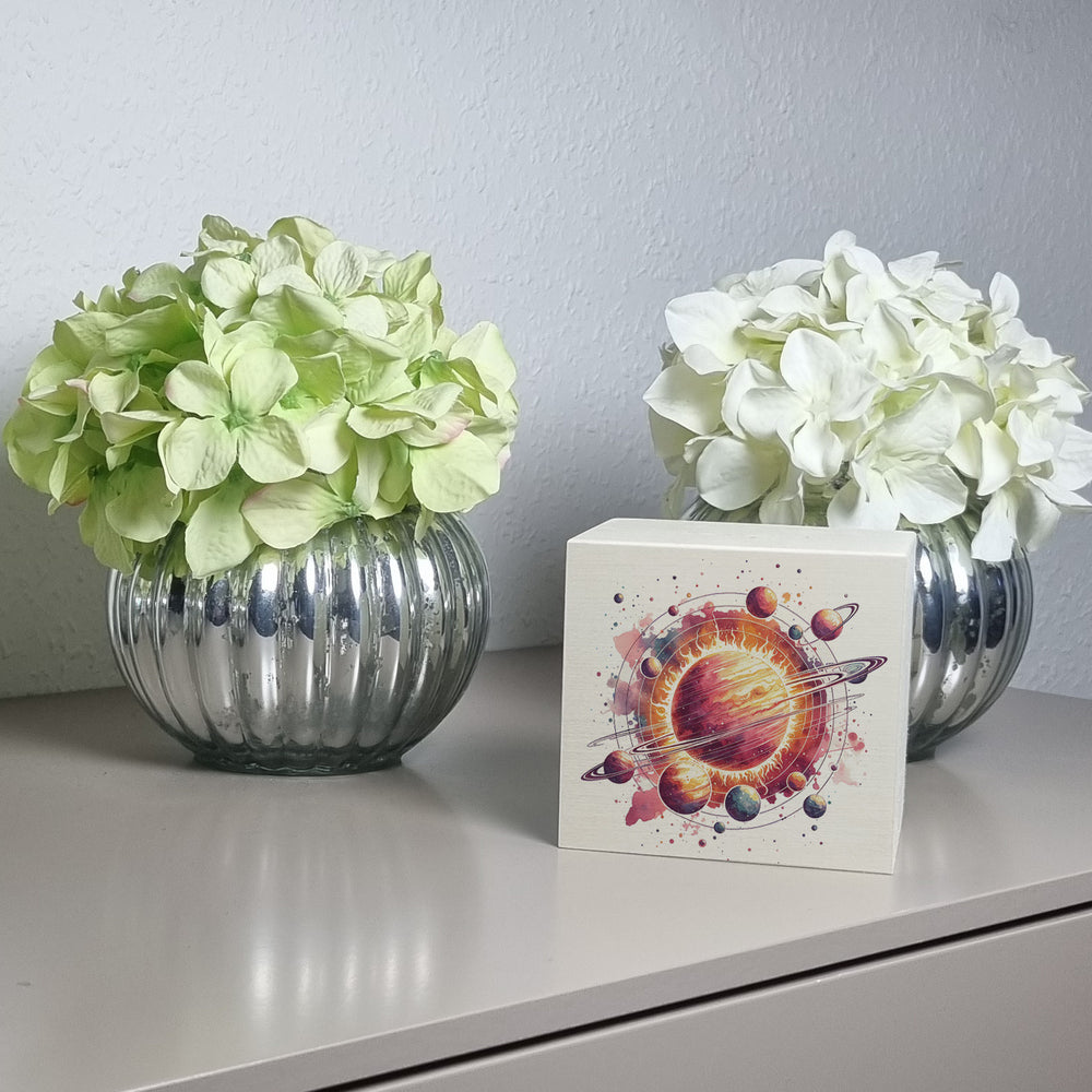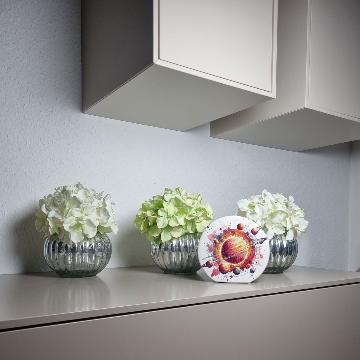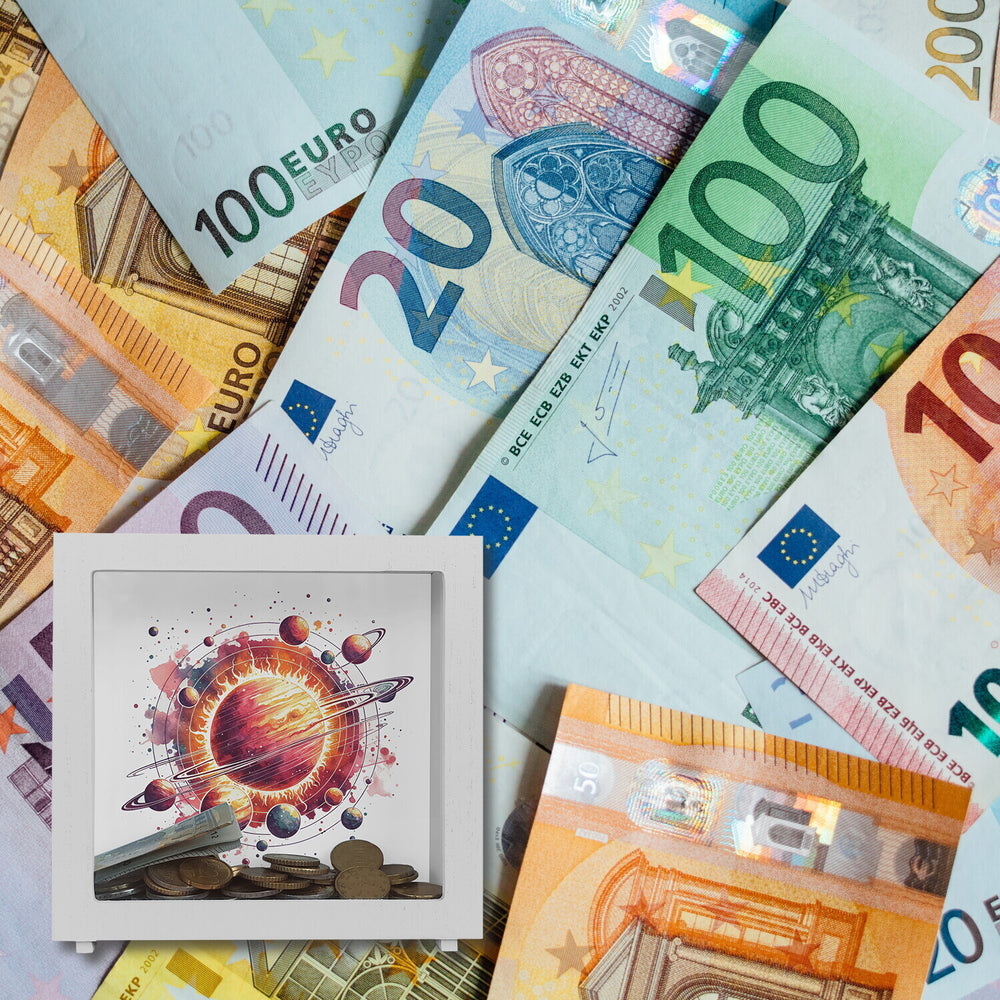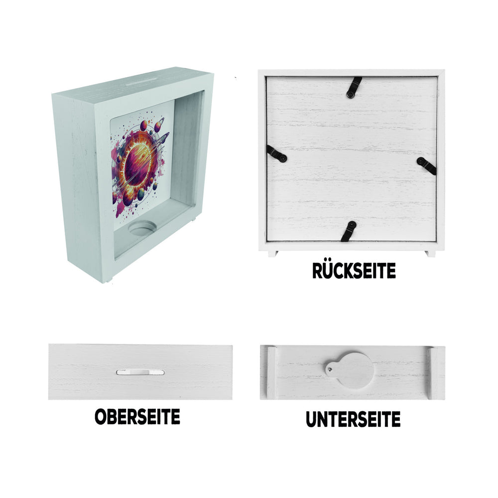 Bist du bereit für eine spacige Sparmission? Unsere Sonnensystem Planeten Spardose ist dein Astronauten-Training fürs Finanzielle! Mit jeder Münze, die du einwirfst, umrundest du Planeten und beschleunigst Richtung deiner finanziellen Ziele – sei es das nächste High-Tech-Teleskop oder der heiß ersehnte Zero-Gravity-Sprung!Diese interstellare Bank kommt in wahlweise als einfache, aber robuste Holzspardose daher, oder in der hochwertigen Keramik-Ausführung für alle, die es ein klein wenig edler mögen. Besonders exklusiv wird es mit unserer Rahmen-Variante aus Holz, bei der jedes eingeworfene Geldstück durch das Sichtfenster bewundert werden kann – ideal also, um das Sparen zu einer echten Show zu machen!Hergestellt in den Weiten unserer Spardosen-Manufaktur in Deutschland, kombiniert diese Spardose Qualität mit Humor. Sie ist bedruckt mit unserem auffordernden Motto Spare dich zu den Sternen! – was für ein kosmischer Motivationsschub!Perfekt, um kleine Sternenforscher spielerisch an Wirtschaftlichkeit heranzuführen oder die Wohnung eines Hobby-Astronomen zu komplettieren. Also, schnapp dir deine Sonnensystem Planeten Spardose und erlebe, wie dein Vermögen die Schwerkraft überwindet. Ein universales Geschenk, das definitiv in Erinnerung bleibt und auf jedem Event für leuchtende Augen sorgt!