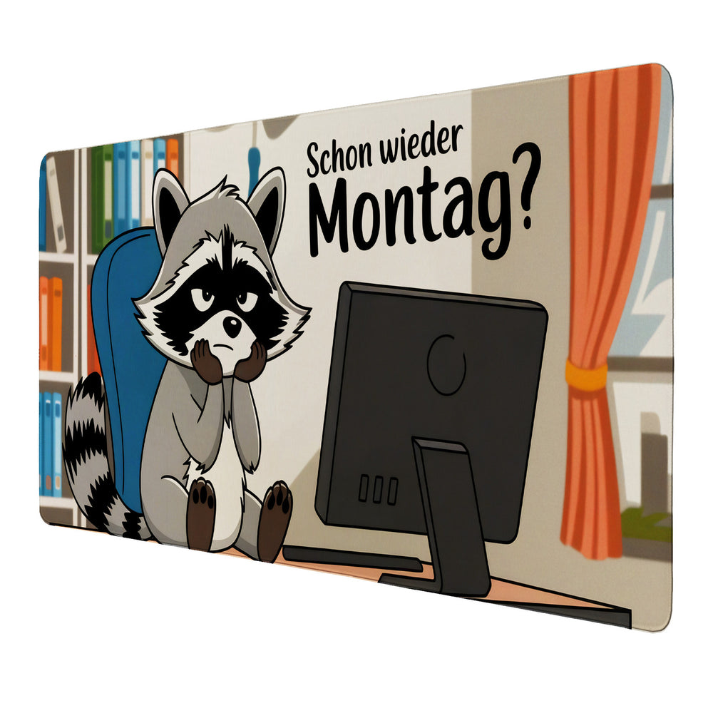 - Starten Sie Ihre Woche mit einem Lächeln! Die "Waschbär am Schreibtisch - Schon wieder Montag" Schreibtischunterlage bringt humorvolle Leichtigkeit an Ihren Arbeitsplatz. Perfekt für alle, die den Montag mit einem lustigen Twist angehen wollen.