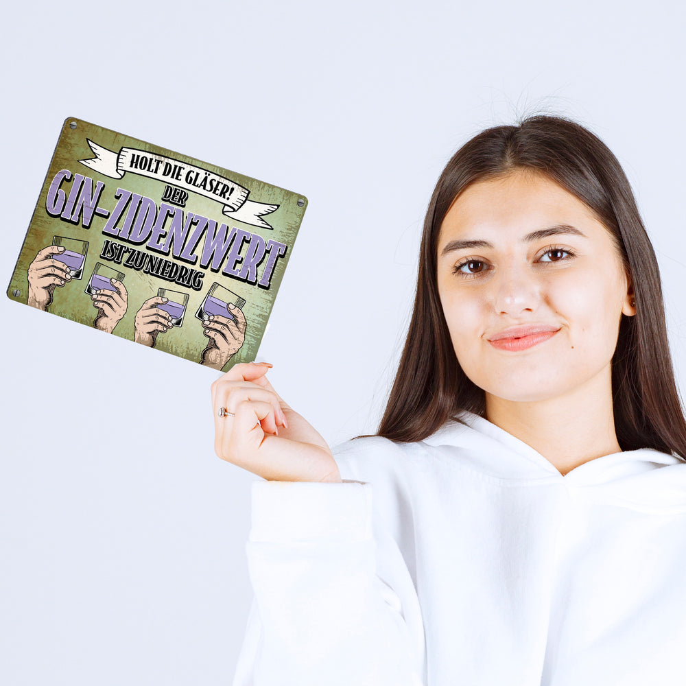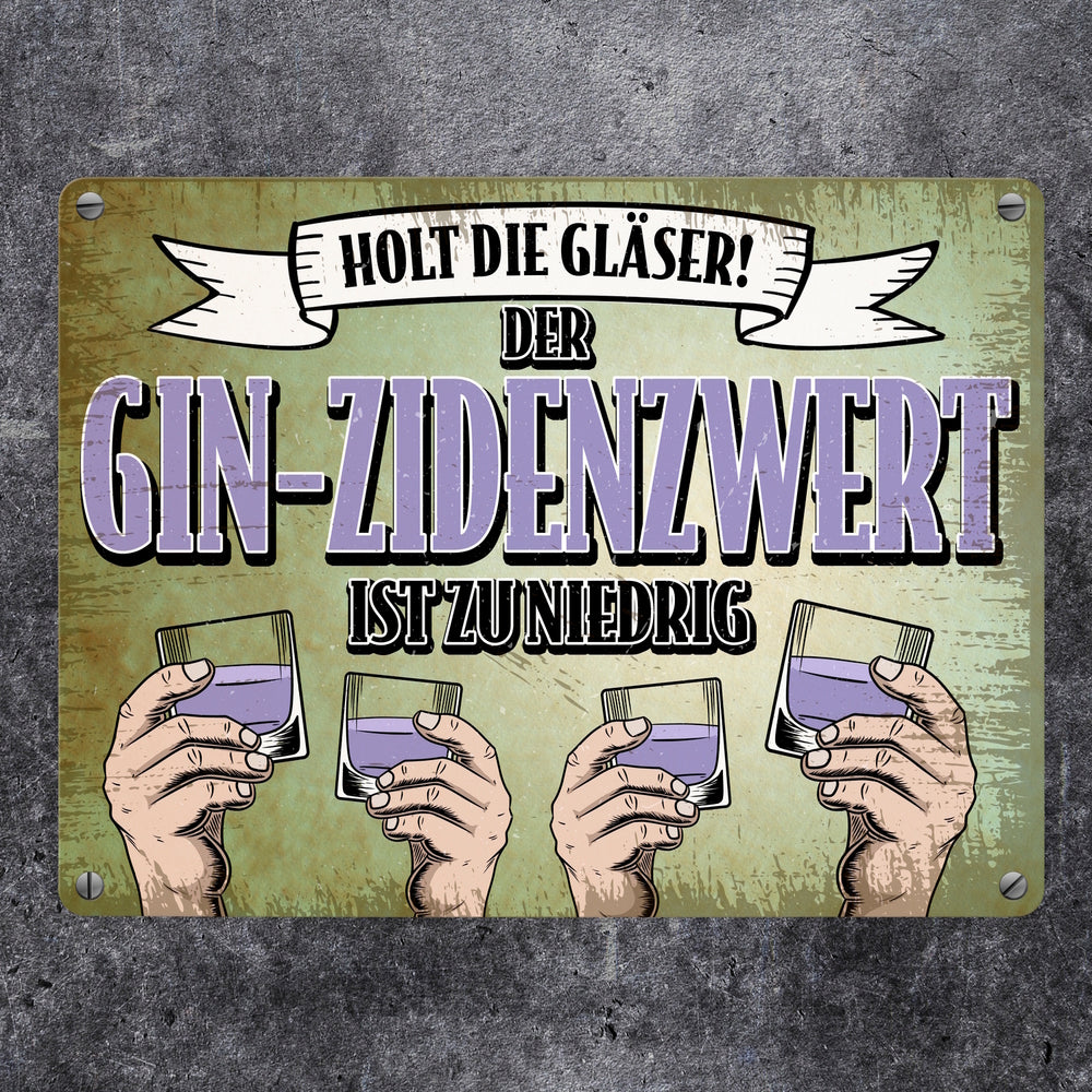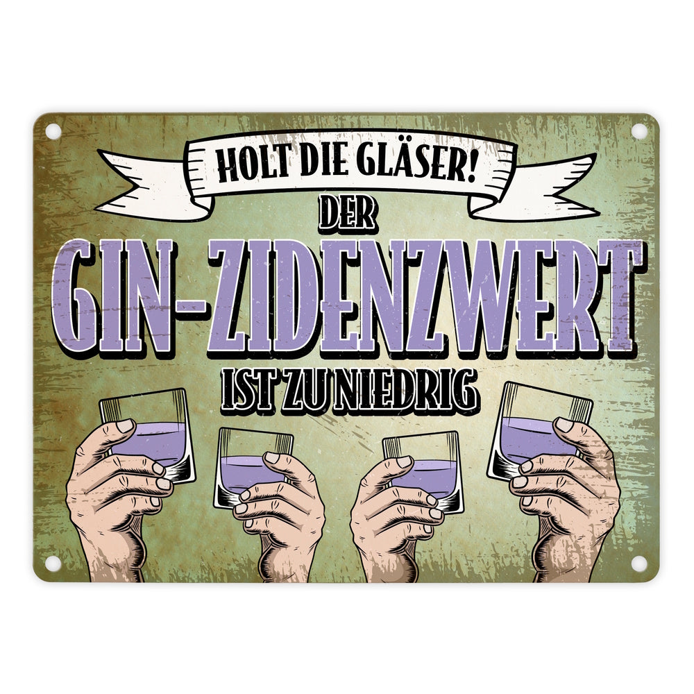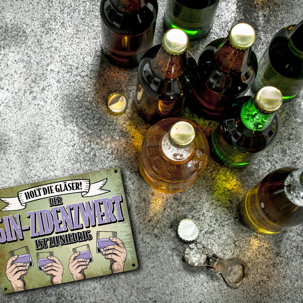 Holt die Gläser! Der Gin-zidenzwert ist zu niedrig - Metallschild im rustikalen Design