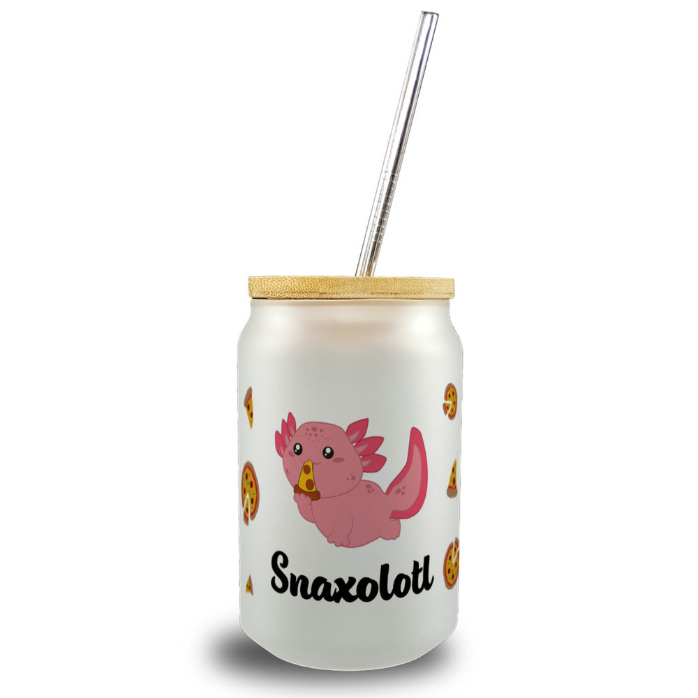 Axolotl Trinkglas mit Bambusdeckel mit Spruch Snaxolotl