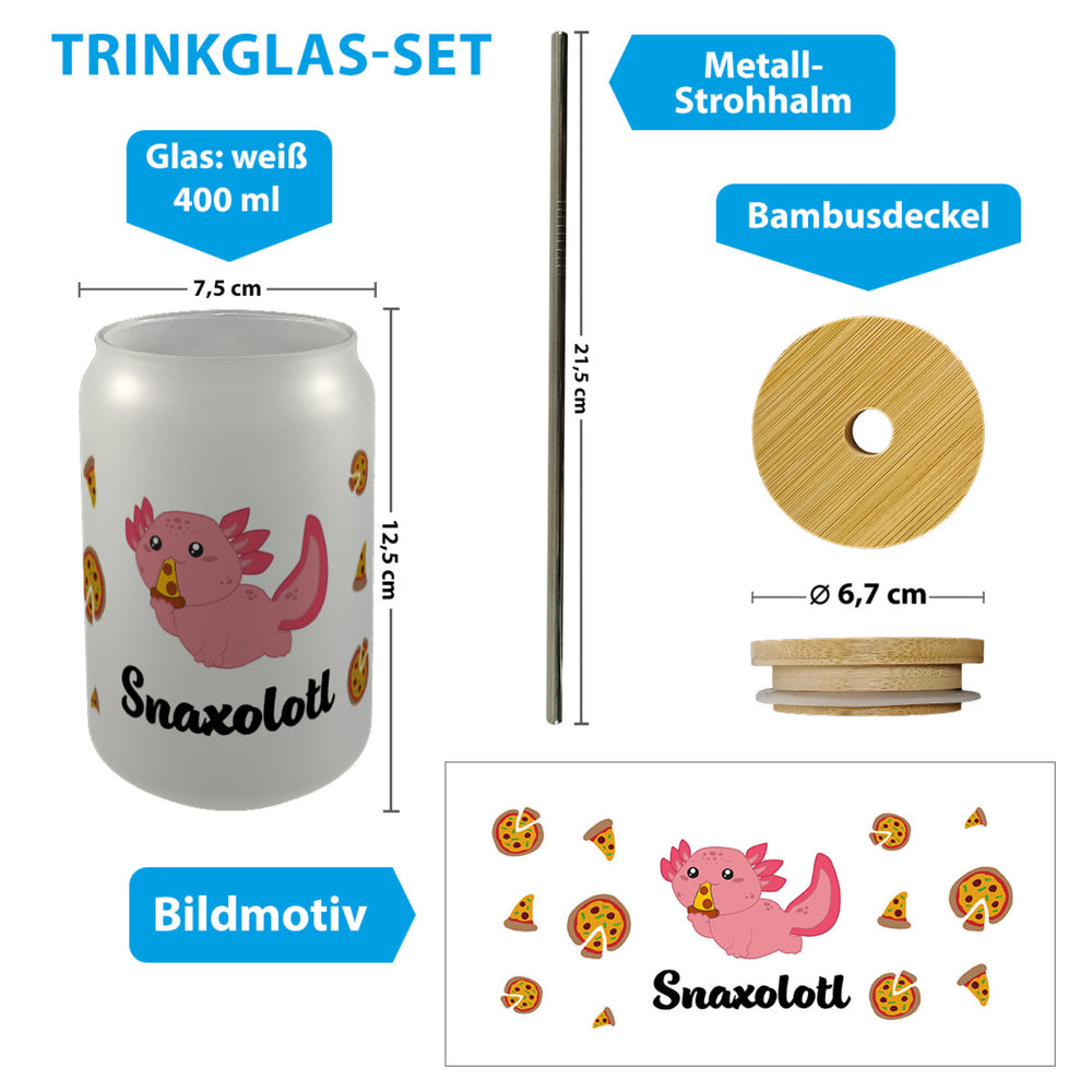 - Lieferumfang: 1x Axolotl Trinkglas mit Bambusdeckel mit Spruch Snaxolotl
