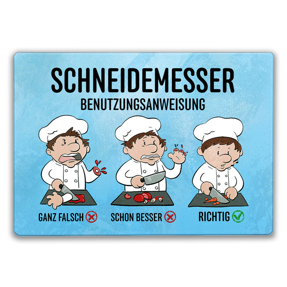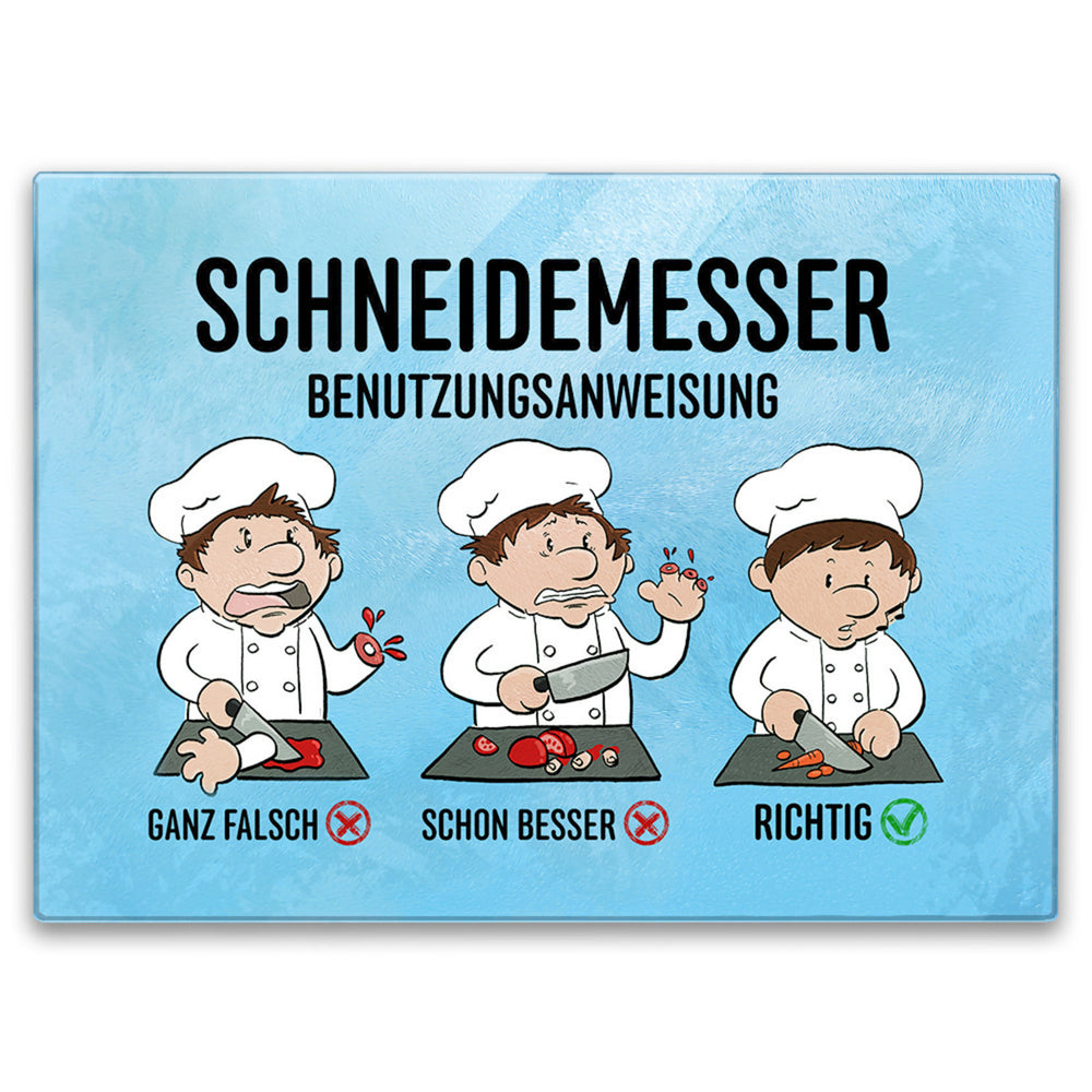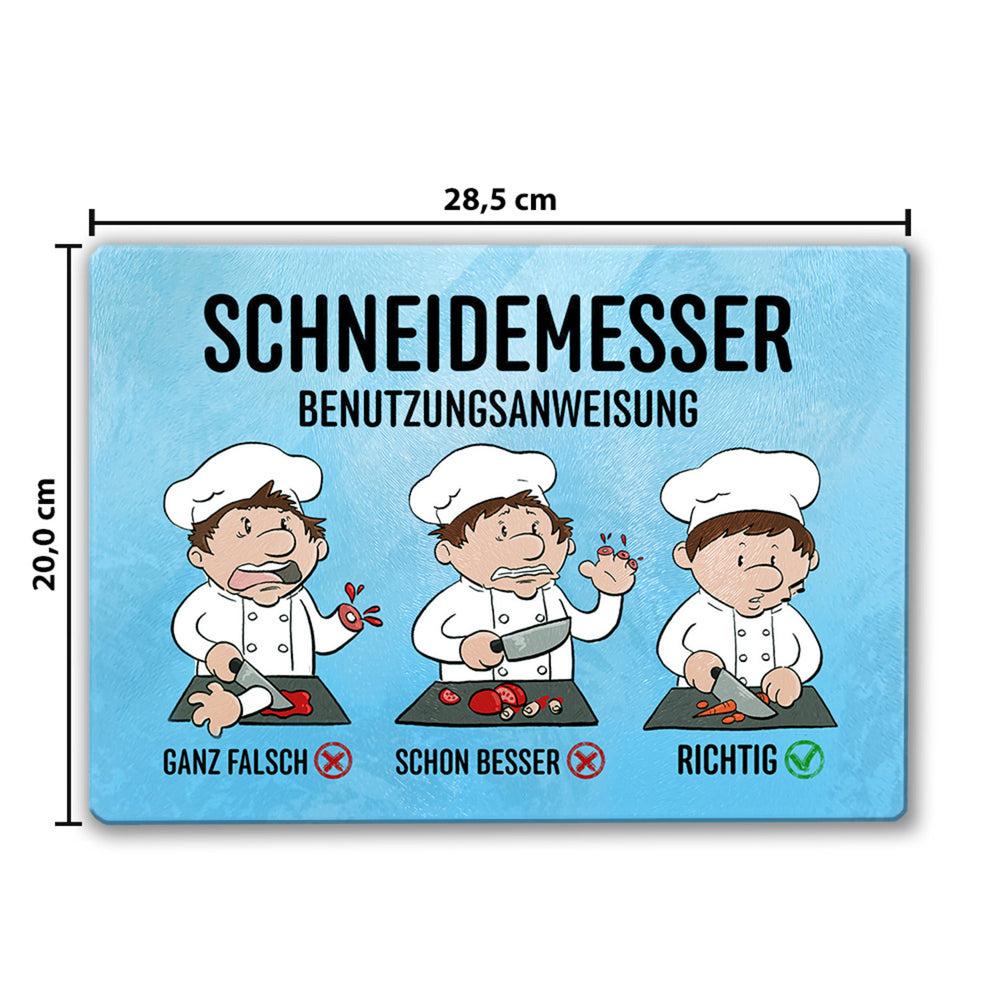 - Das Glas-Schneidebrett präsentiert sich mit einem humorvollen Schneidemesser-Motiv und einer anschaulichen Benutzungsanweisung für Messer. Ein unentbehrliches Küchenutensil für Hobby- und Profiköche, die nicht nur die richtige Haltung beim Schneiden lernen, sondern auch ihren Gästen ein Schmunzeln entlocken möchten.