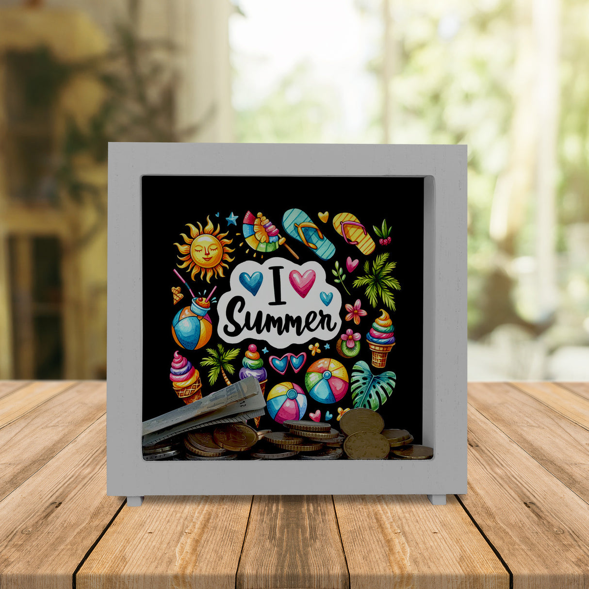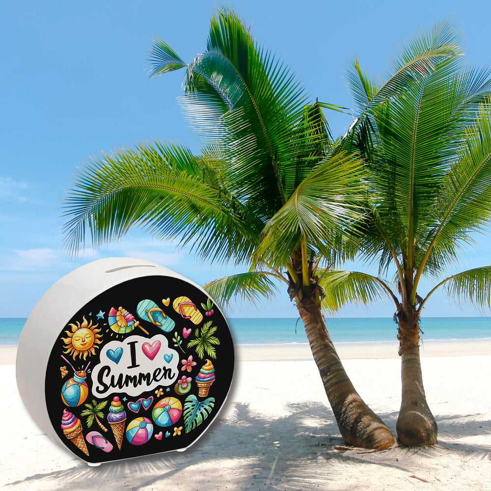 - 1x Endlich Sommer Spardose mit Spruch I love Summer in der gewählten Ausführung
