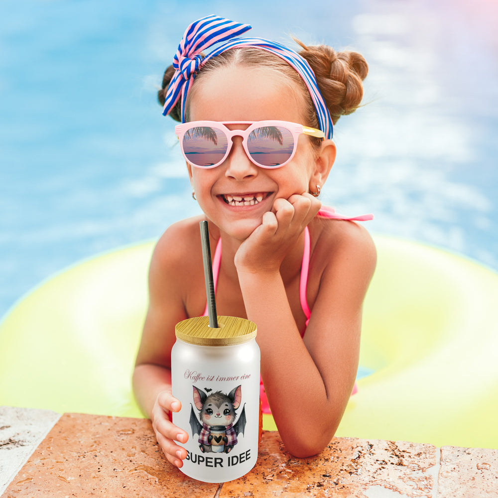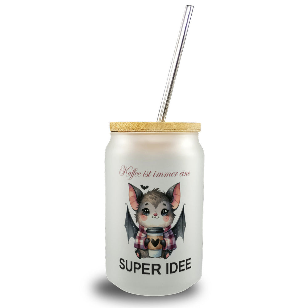 Hol Dir jetzt dieses süße Fledermaus-Trinkglas und mach jeden Morgen zu einem kleinen Abenteuer! Mit Ohren, Flügeln und ganz viel Charme zaubert es Dir garantiert ein Lächeln ins Gesicht – denn Kaffee ist immer eine super Idee!Dieses Trinkglas bringt ordentlich Pep in Deine Kaffeepause! Eine niedliche Fledermaus mit riesigen, neugierigen Augen hält liebevoll einen Kaffeebecher mit Herz – einfach zum Verlieben! Der Spruch Kaffee ist immer eine super Idee versüßt jeden Schluck.Erhältlich mit Bambusdeckel oder praktischem Henkel. Für alle Kaffee-Liebhaber und Fledermaus-Fans gibt es jetzt das ultimative Trinkglas, das eure Herzen höherschlagen lässt! Die niedliche Fledermaus mit großen, neugierigen Augen und einem bezaubernden Lächeln hält einen Kaffeebecher fest umklammert – bereit, jeden Morgen mit euch in den Tag zu starten. Der liebevolle Spruch Kaffee ist immer eine super Idee auf dem Glas macht klar: Hier wird Koffein genauso geschätzt wie fliegende Säugetiere!Dieses Trinkglas ist perfekt für alle, die gerne einen Hauch von Magie und Niedlichkeit in ihren Alltag bringen möchten. Ob du deinen morgendlichen Kaffee genießt, einen erfrischenden Eistee am Nachmittag oder ein warmes Getränk am Abend – dieses Glas macht jede Trinkpause zu etwas Besonderem.