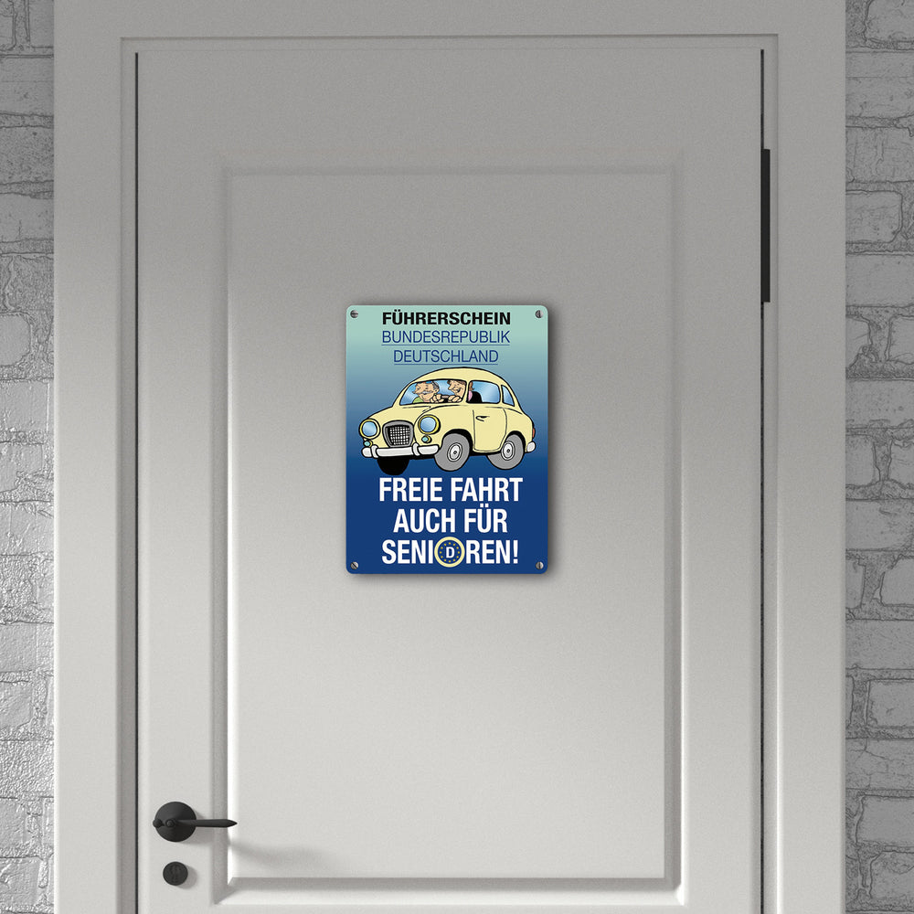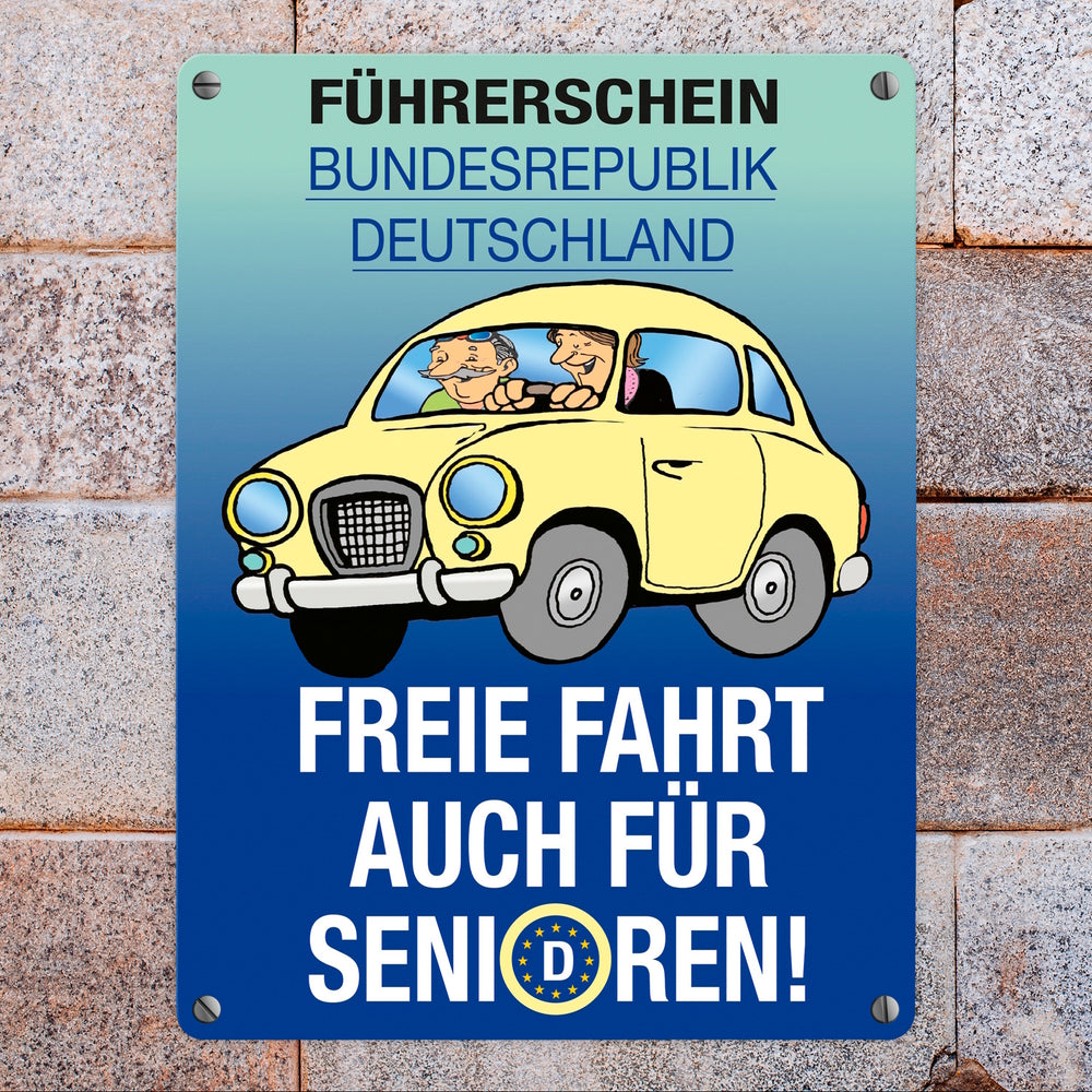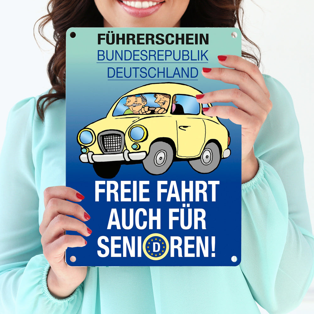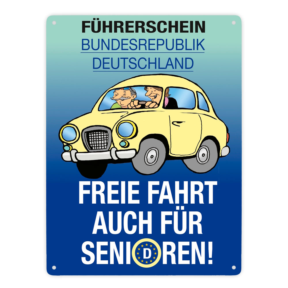 - 1x Freie Fahrt auch für Senioren Metallschild mit Oldtimer Motiv in der gewählten Größe