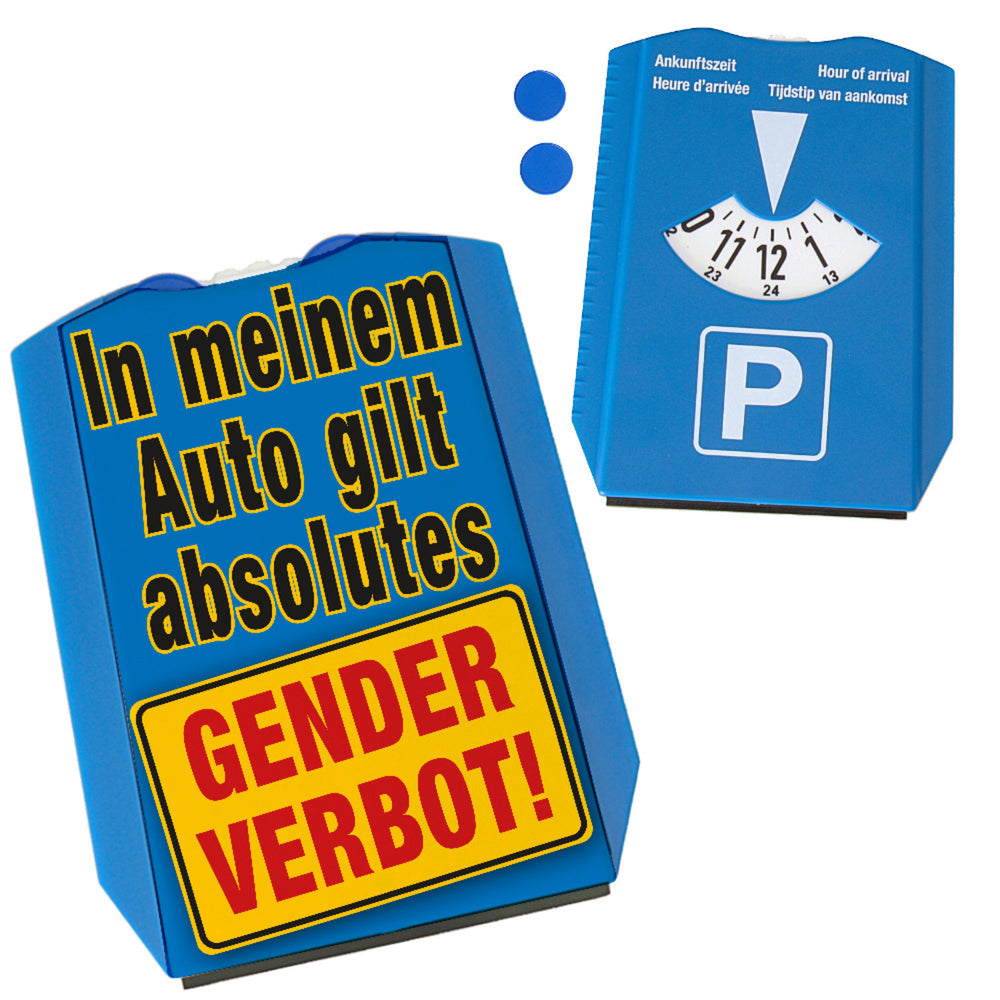 - Diese Parkscheibe ist nicht nur praktisch, sondern auch ein Statement! Eindeutig mehr als nur ein Zeitzeuge – hier wird mit Augenzwinkern das Genderthema geparkt. Die klare Ansage "In meinem Auto gilt absolutes Genderverbot" bringt bestimmt jeden Mitfahrer zum Schmunzeln.