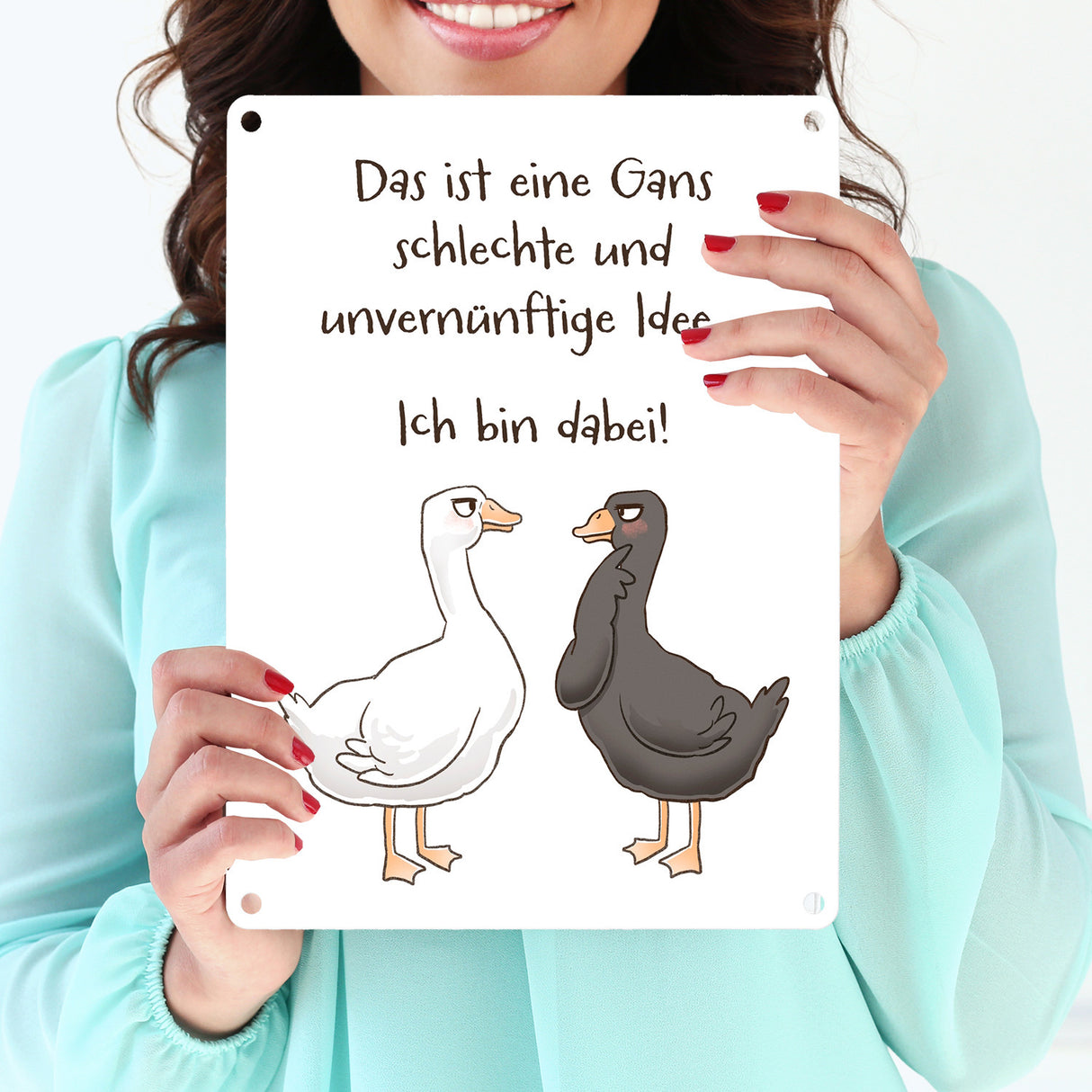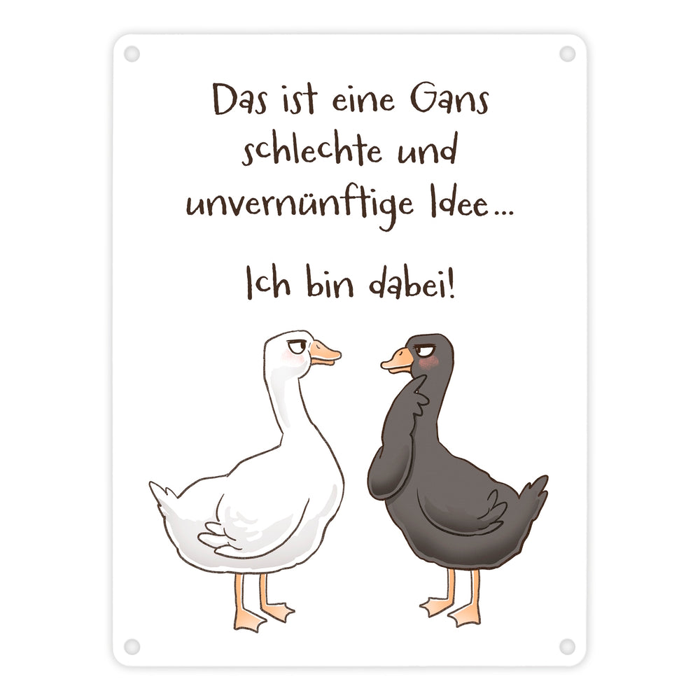 Gilbert die Gans Metallschild in 15x20 cm mit Spruch Schlechte Idee - Bin dabei