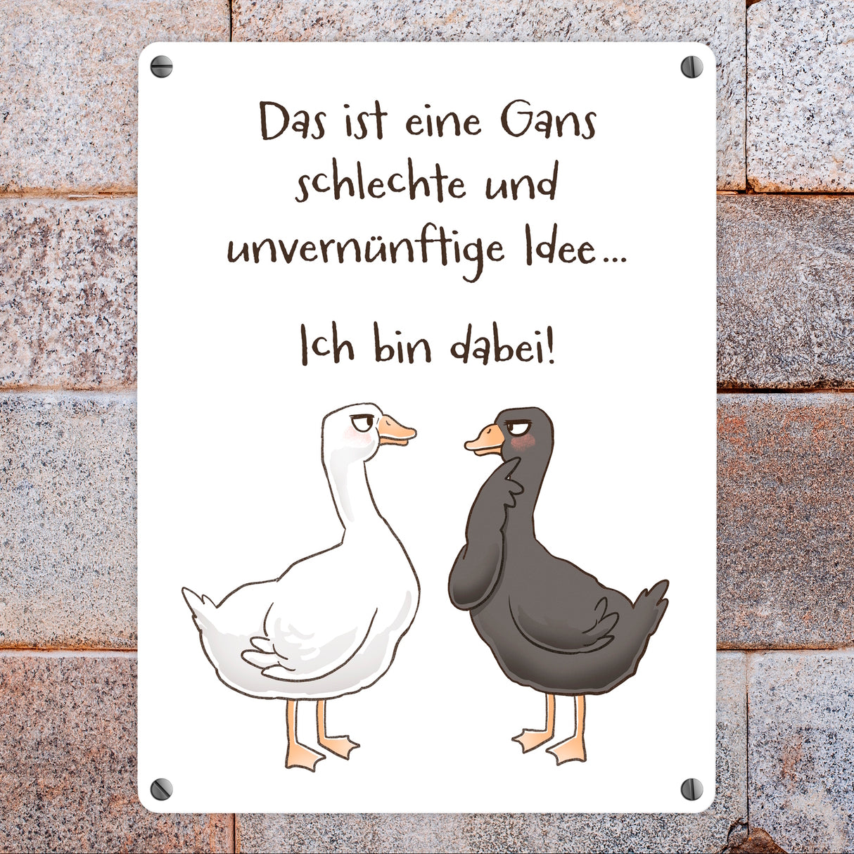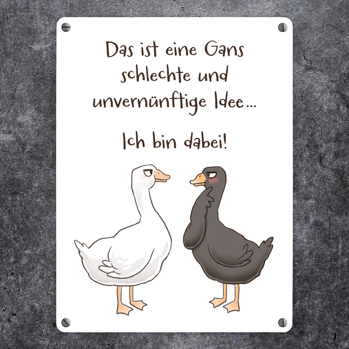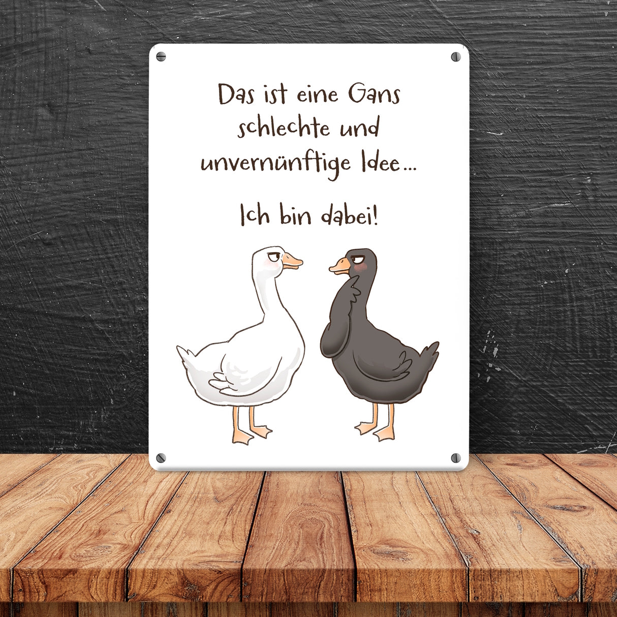• 1x Gilbert die Gans Metallschild in 15x20 cm mit Spruch Schlechte Idee - Bin dabei in der gewählten Größe