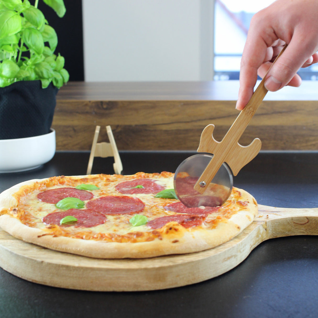 Ein Pizzaschneider im Design einer Gitarre, ein Muss für jeden Musiker. Material: Holz,Edelstahl | Dies ist kein Spielzeug! Nur von Hand waschen - nicht für die Spülmaschine geeignet. Bitte vor dem ersten Gebrauch auswaschen.