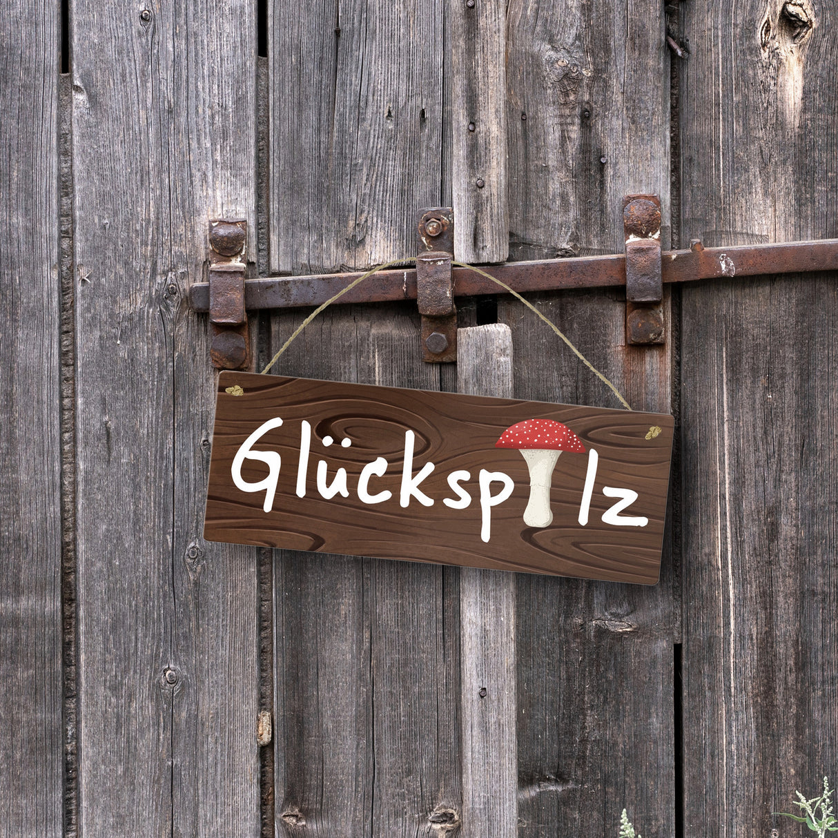 - 1x Glückspilz Metallschild in Holzoptik in der gewählten Größe