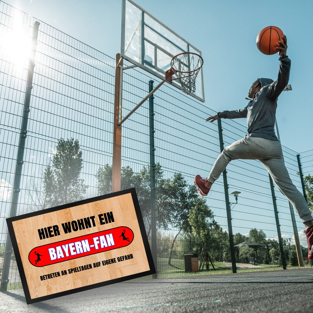 Hier wohnt ein Bayern-Fan Fußmatte in 35x50 cm mit Turnhallenboden Motiv