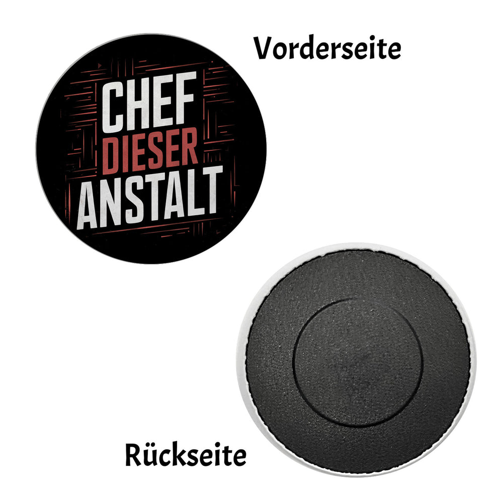 - Dieser runde Magnet ist ein absoluter Hingucker! Mit einem edel-düsteren schwarzen Hintergrund und dem fetten, dominanten Text "Chef dieser Anstalt" in Weiß und Rot, wirst du garantiert nicht übersehen.