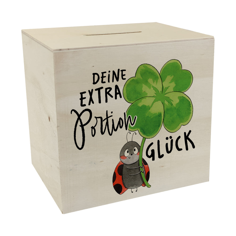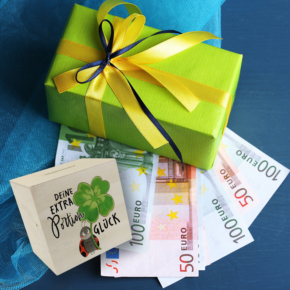 - 1x Marienkäfer Spardose mit Spruch Deine extra Portion Glück in der gewählten Ausführung
