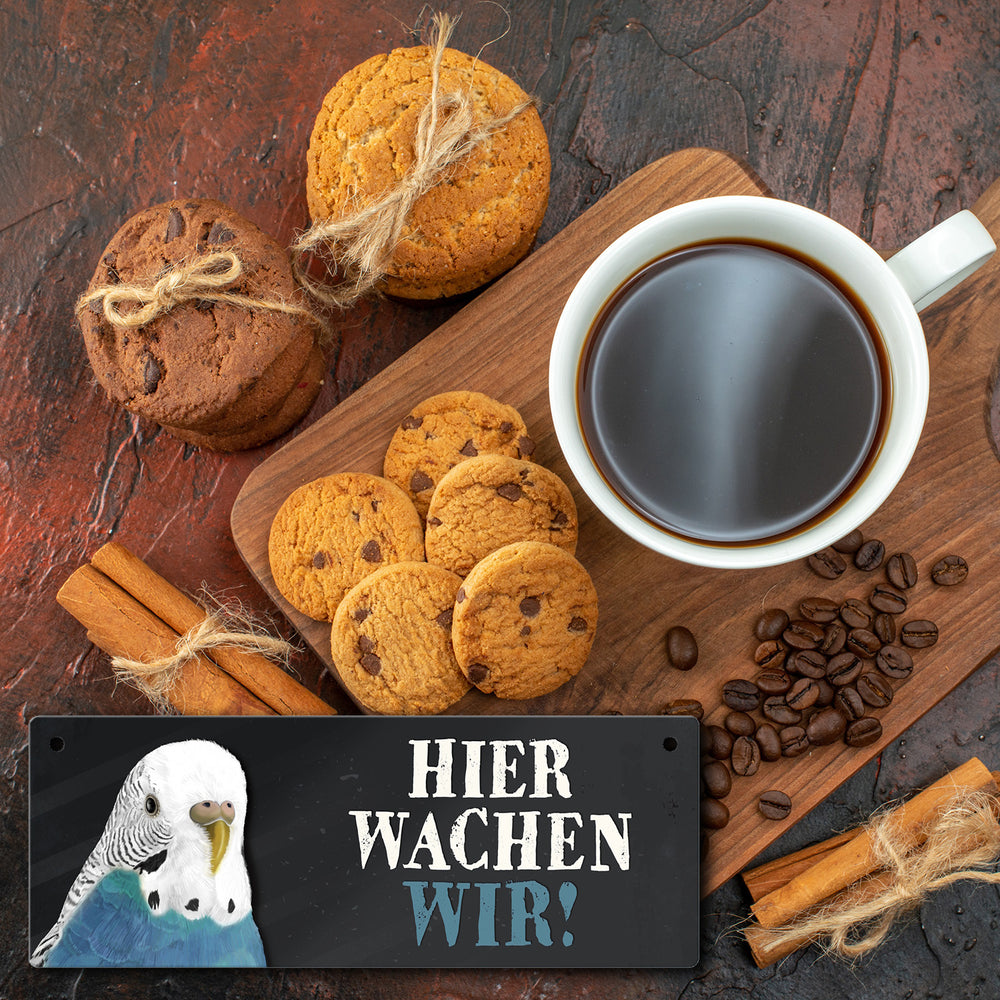 Metallschild mit Wellensittich blau Motiv und Spruch: Hier wachen wir!