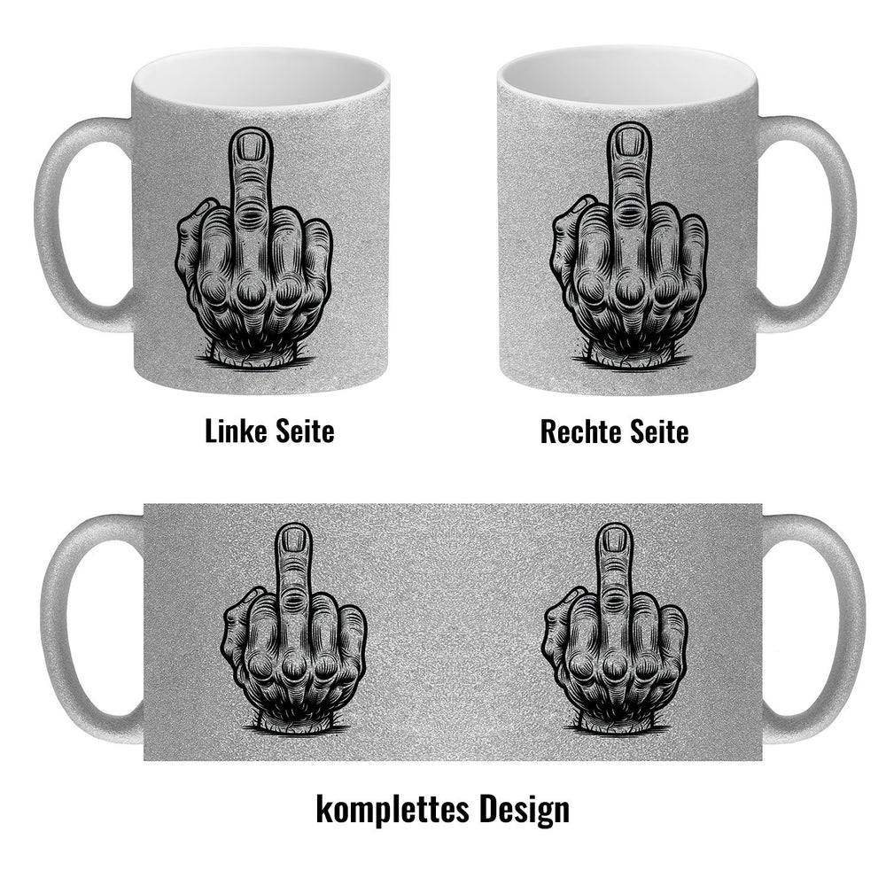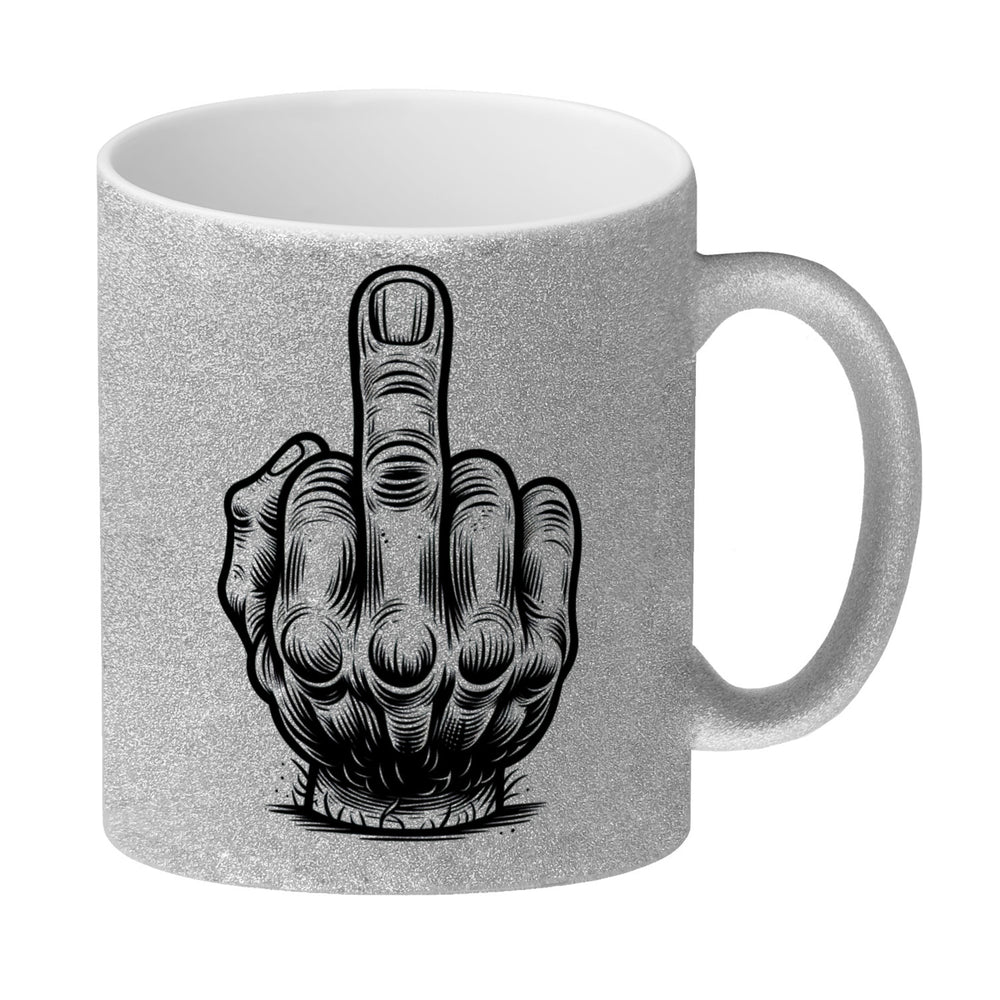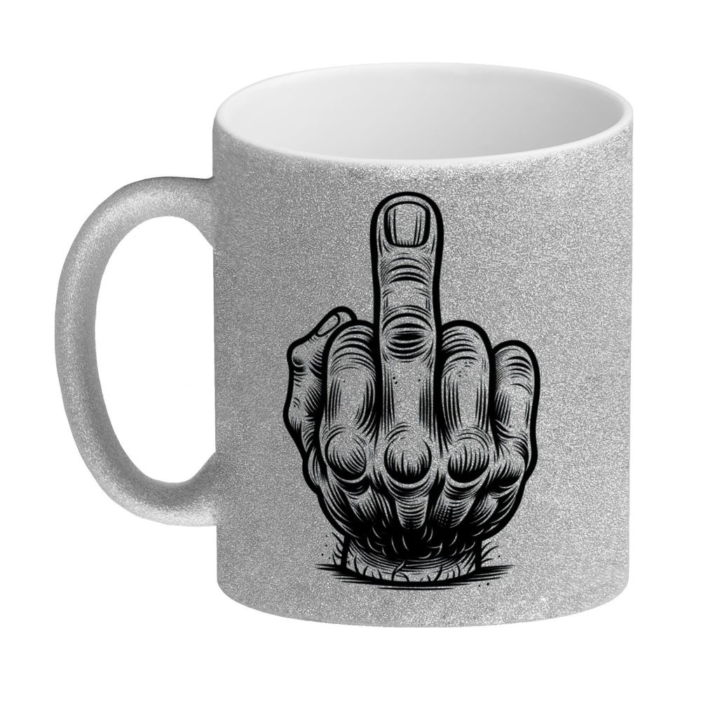 Starten Sie mit einem Lächeln und einem Augenzwinkern in den Tag – mit dem Mittelfinger Comic Kaffeebecher! Dieses freche Accessoire ist der ideale Gefährte für alle, die morgens Ihren Kaffee mit einer gehörigen Dosis Humor genießen möchten. Ob Sie die Stimmung im Büro aufmischen oder die Nachbarn beim sonntäglichen Brunch aus der Reserve locken wollen, dieser Becher trifft garantiert ins Schwarze!Der Becher präsentiert stolz einen riesigen Comic-Stinkefinger – so setzen Sie bei jeder Kaffeerunde ein unmissverständliches Zeichen. Erhältlich in verschiedenen Styles – wählen Sie zwischen der schlichten weißen Variante, einem Modell mit farbigem Henkel und Innenseite, einer edlen Glastasse oder der exklusiven Silberedition mit Glitzereffekt. Jede Ausführung wird mit größter Sorgfalt in unserer deutschen Tassen-Manufaktur bedruckt.Der Mittelfinger Comic Kaffeebecher ist mehr als nur ein Getränkebehälter. Er ist ein Statement, das ohne Worte auskommt. Vervollständigen Sie Ihre Küchenutensilien um ein Element, das Gespräche entfacht und mit Sicherheit für einige herzhafte Lacher sorgt. Perfekt als Geschenk, wird dieser Becher Ihren Kumpels oder Kollegen zeigen, dass Sie auch die alltäglichen Dinge mit einem leichten Schmunzeln nehmen. Wer sagt, dass Kaffeepausen langweilig sein müssen? Also, erheben Sie den Mittelfinger – natürlich nur den auf Ihrem neuen Lieblingsbecher!