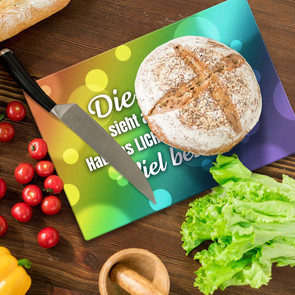 • 1x Saustall Schneidebrett aus Glas mit Spruch Hab das Licht ausgeschaltet Viel besser in der gewählten Größe