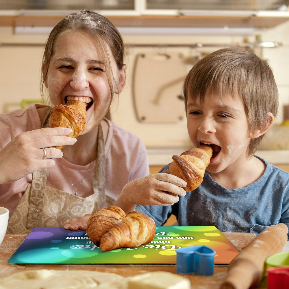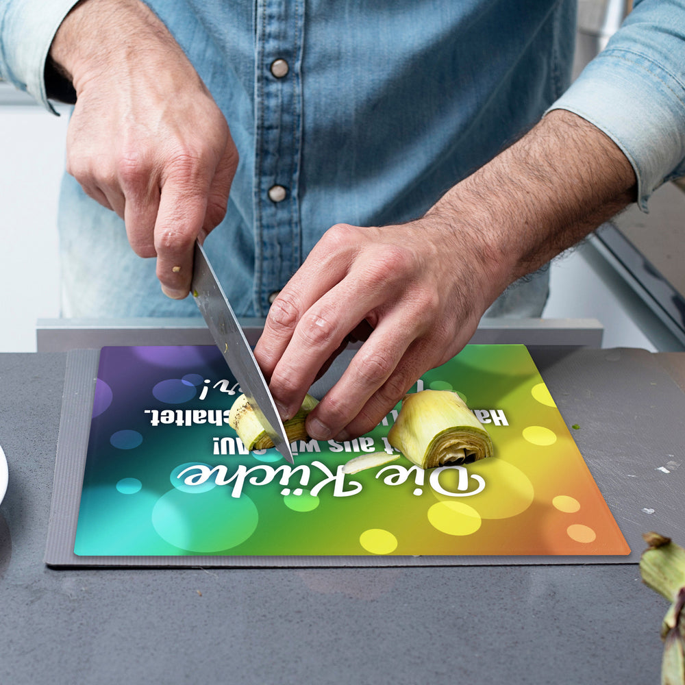 • Unser lustiges Schneidebrett ist ein echter Hingucker in jeder Küche. Mit seinem bunten Hintergrund und den blassen Kreisen sorgt es für Farbe und gute Laune. Es ist ein Glas-Schneidebrett, ideal für alle Hobby- und Profiköche, die Wert auf eine humorvolle Zubereitung ihrer Speisen legen. Denn wer sagt, dass Kochen nicht auch Spaß machen darf?