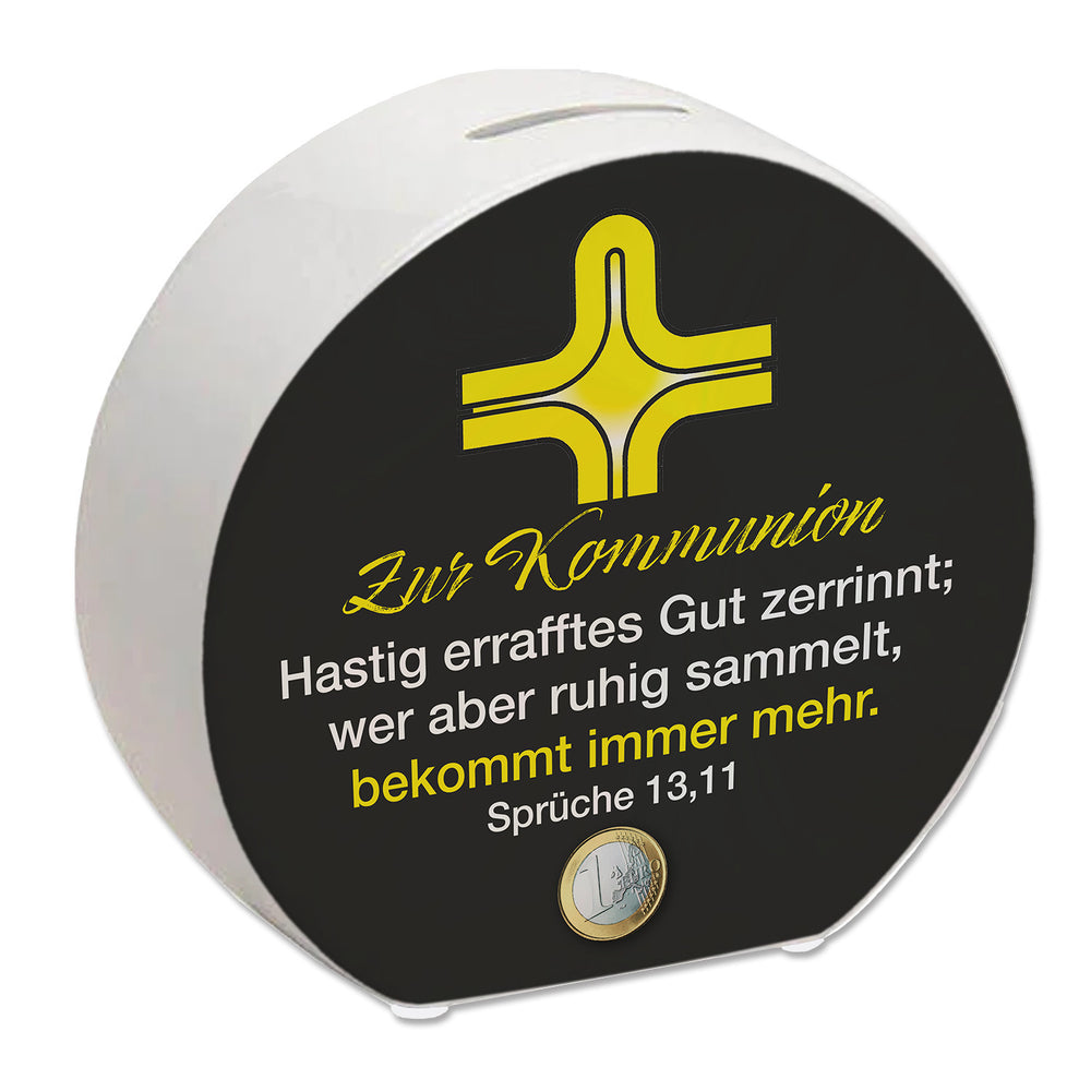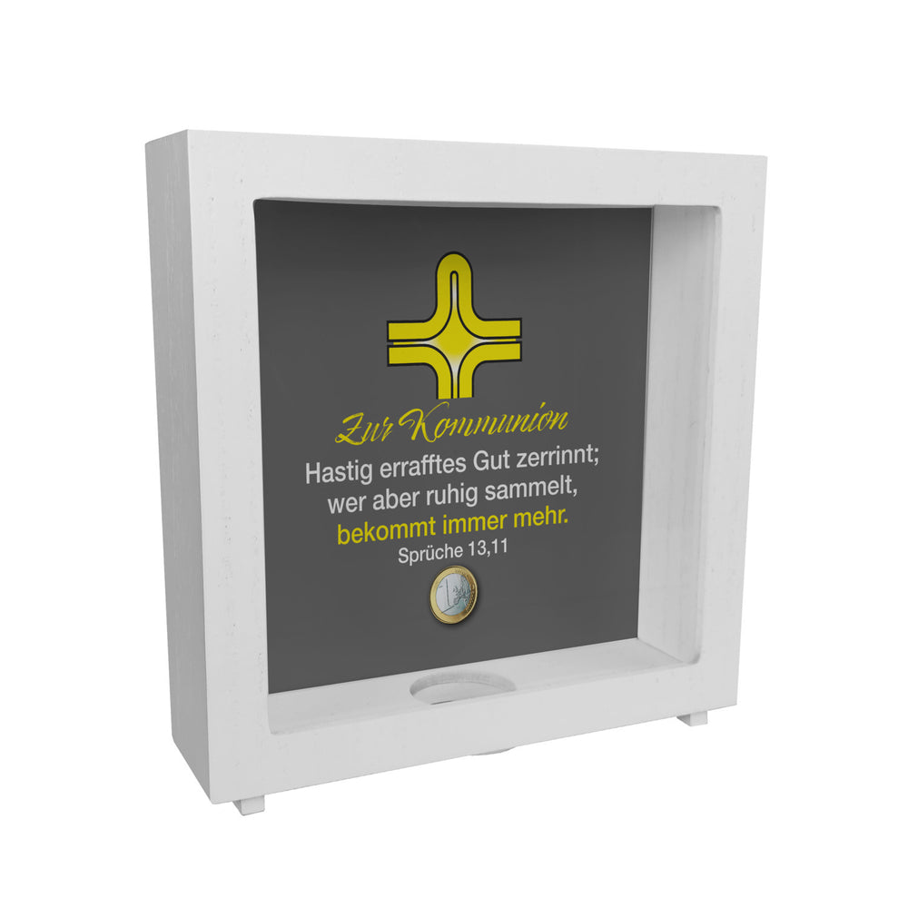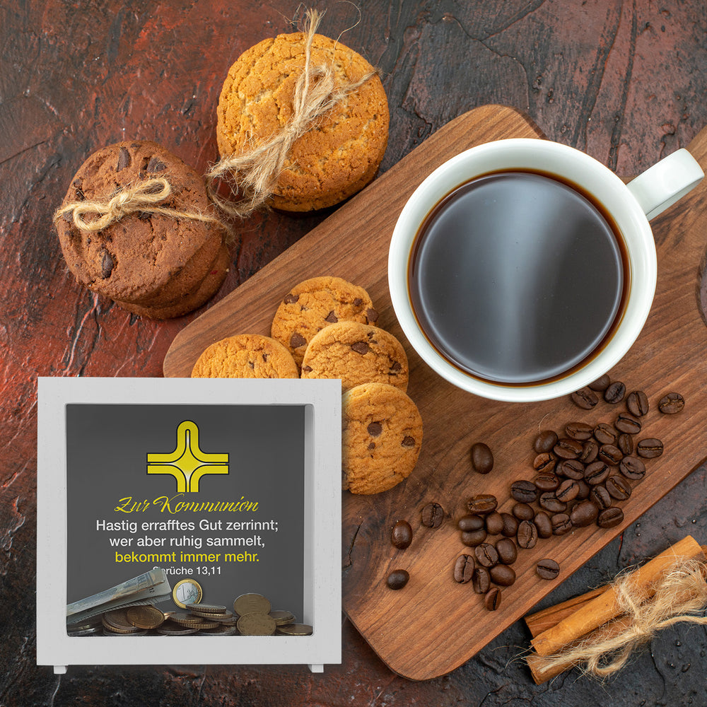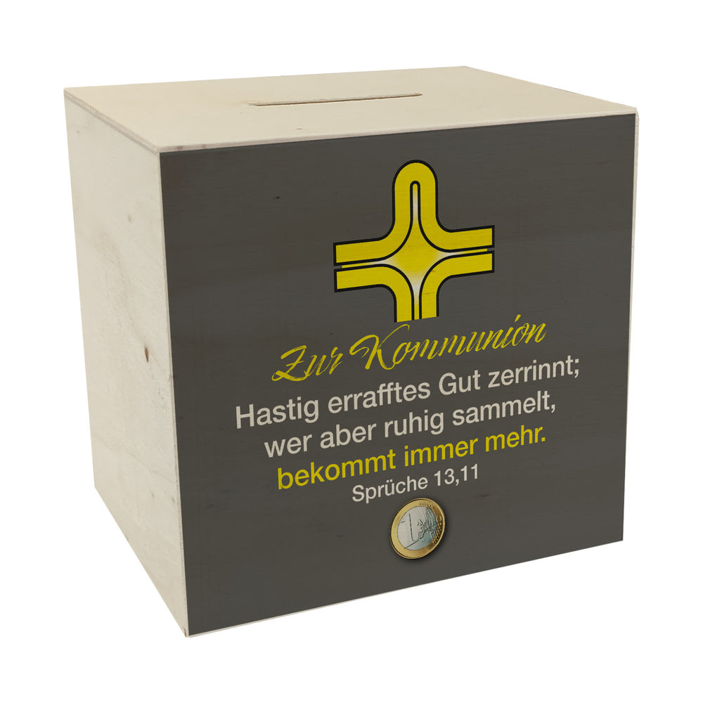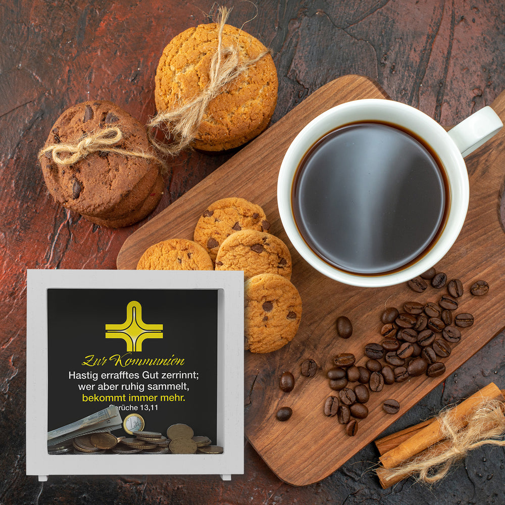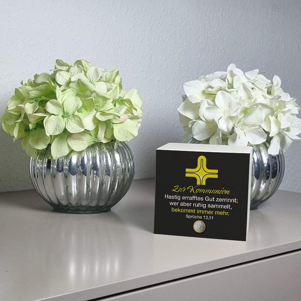 • 1x Sprüche 13,11 Bibelvers Spardose zur Kommunion in der gewählten Ausführung