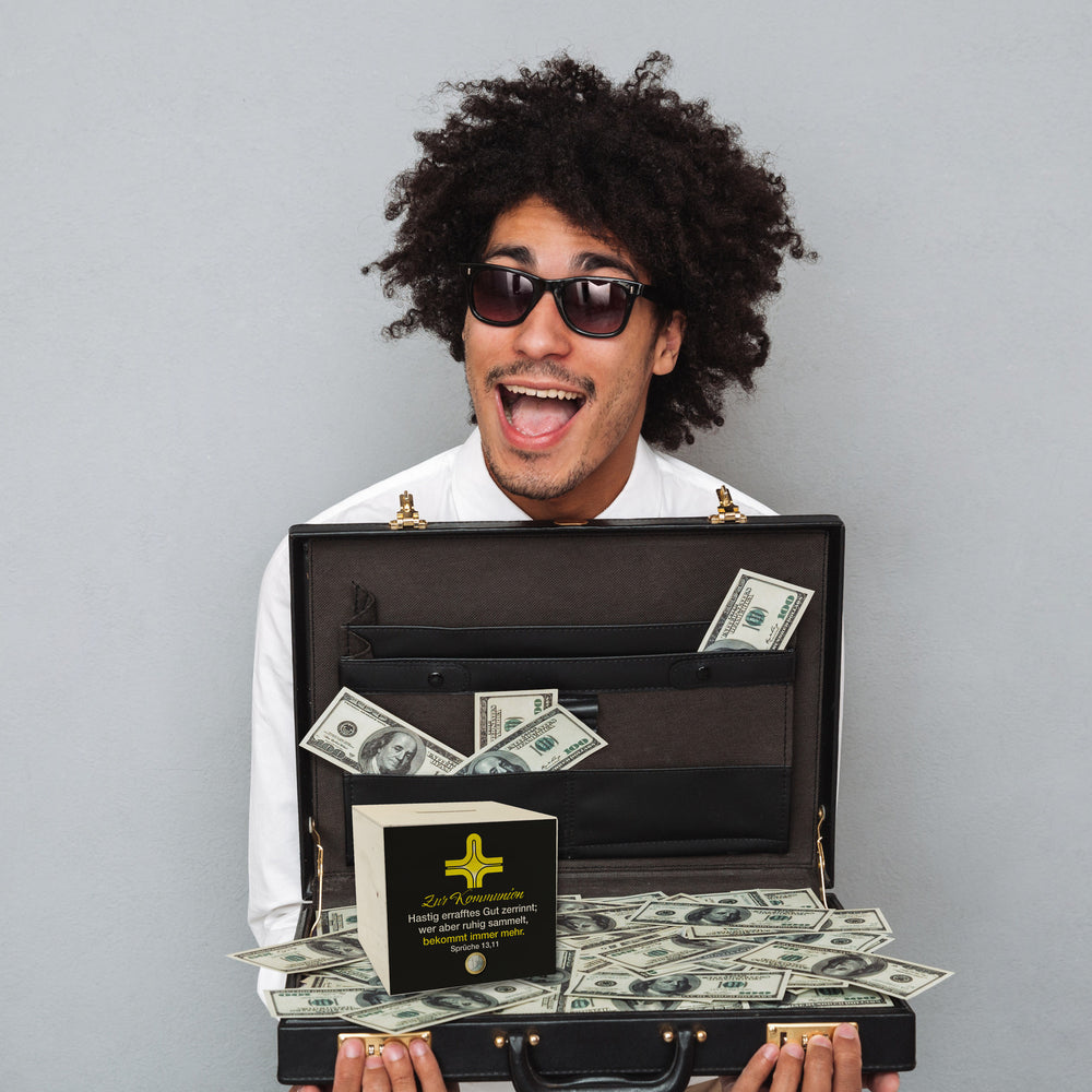 Verehrte Sparer und Hüter der Frommheit, präsentieren wir: die Sprüche 13,11 Bibelvers Spardose, einen schwarzen Schatzbehälter für all jene, die den Wert des Geldes und des Glaubens schätzen. Mit einem leuchtenden, gelben Kreuz auf tiefem Schwarz vermittelt diese Spardose mehr als nur praktischen Nutzen – sie ist eine tägliche Erinnerung an die Weisheit: Hastig errafftes Gut zerrinnt; wer aber ruhig sammelt, bekommt immer mehr. Verabschiedet euch von weltlichen Verführungen und heißen Tipp-Aktien! Hier kommt das Geschenk zur Kommunion, das Lehre und Lachen gleichermaßen schenkt. Ob als Gebet vor dem Betthimmel oder als finanzielles Fundament auf dem Schreibtisch – die Kreuz Spardose ist das Must-have für spirituelle Sammler.Wähle aus der rustikalen Holzspardose, der edlen Keramik-Ausführung oder dem exklusiven Rahmenmodell mit Sichtfenster für eine schicke Geldgeschenk-Präsentation. In unserer deutschen Spardosen-Manufaktur sorgfältig bedruckt, garantiert dieses kleine Objekt göttlicher Kontenführung Langlebigkeit und Stil.Gönne deinen Liebsten zur Kommunion ein Geschenk, das nicht nur monetären, sondern auch spirituellen Reichtum vermehrt. Die Spardose für Gläubige, die wissen: Ein echter Schatz wächst aus Geduld und Glaube. Und immer dran denken – wer langsam sammelt, der sammelt mehr! Sprüche 13,11 lässt grüßen!