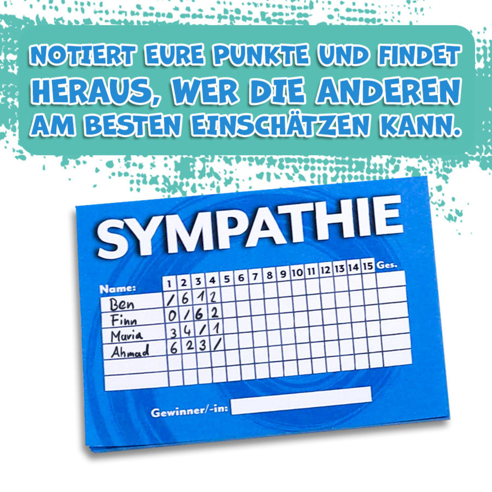 Sympathie, das Kartenspiel, ist die perfekte Möglichkeit, um sich und andere besser kennenzulernen. Das Spiel eignet sich für bis zu sechs Spieler und liefert 150 Fotos aus 6 verschiedenen Kategorien. In der praktischen Transportbox findet man neben den Karten auch eine Anleitung, 6 Spielerkarten und einen Wertungsblock mit 50 Blättern. Mit Sympathie wird Dein Spieleabend garantiert zu etwas Besonderem und ermöglicht Dir, mehr über Deine Mitspieler zu erfahren. Vergiss nicht: das Gewinnerteam ist nicht dasjenige mit den meisten Punkten, sondern jenes mit der größten Sympathie!