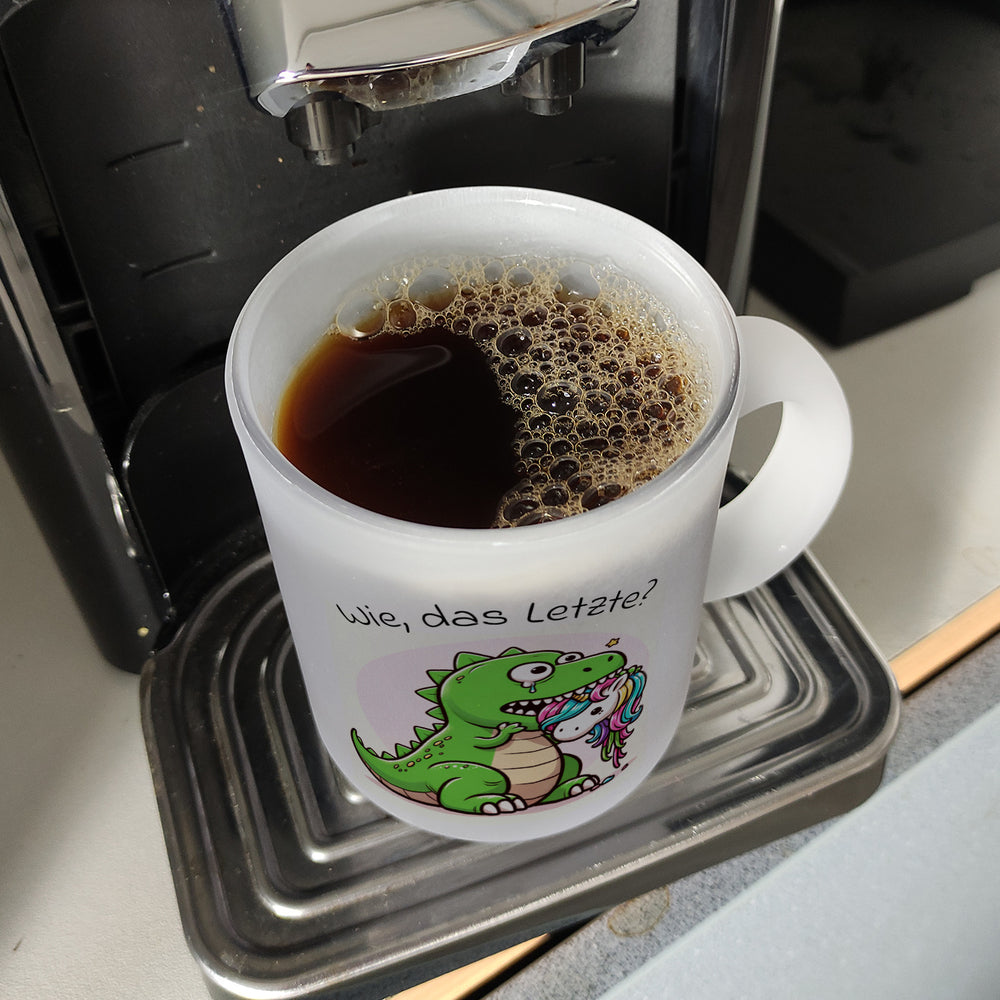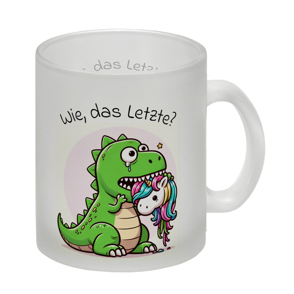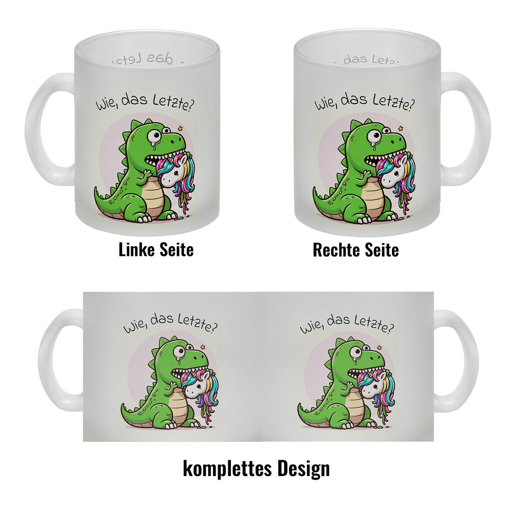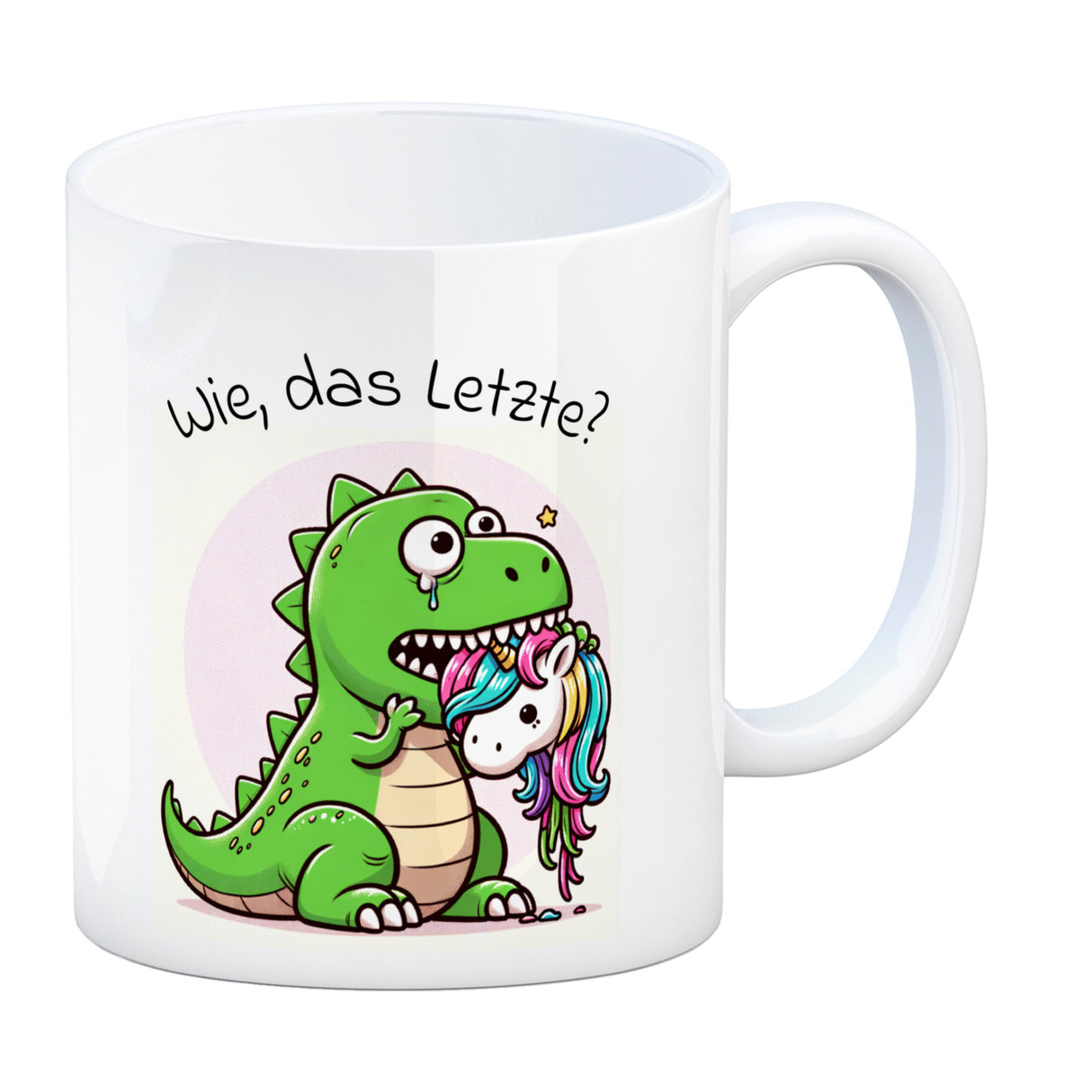 • 1x T-Rex Dinosaurier frisst Einhorn Kaffeebecher mit Spruch Wie das Letzte? in der gewählten Ausführung