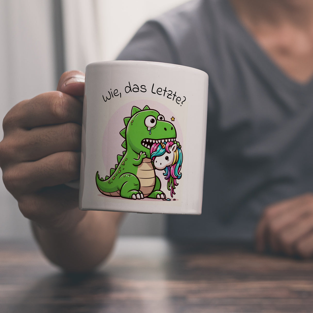 T-Rex Dinosaurier frisst Einhorn Kaffeebecher mit Spruch Wie das Letzte?
